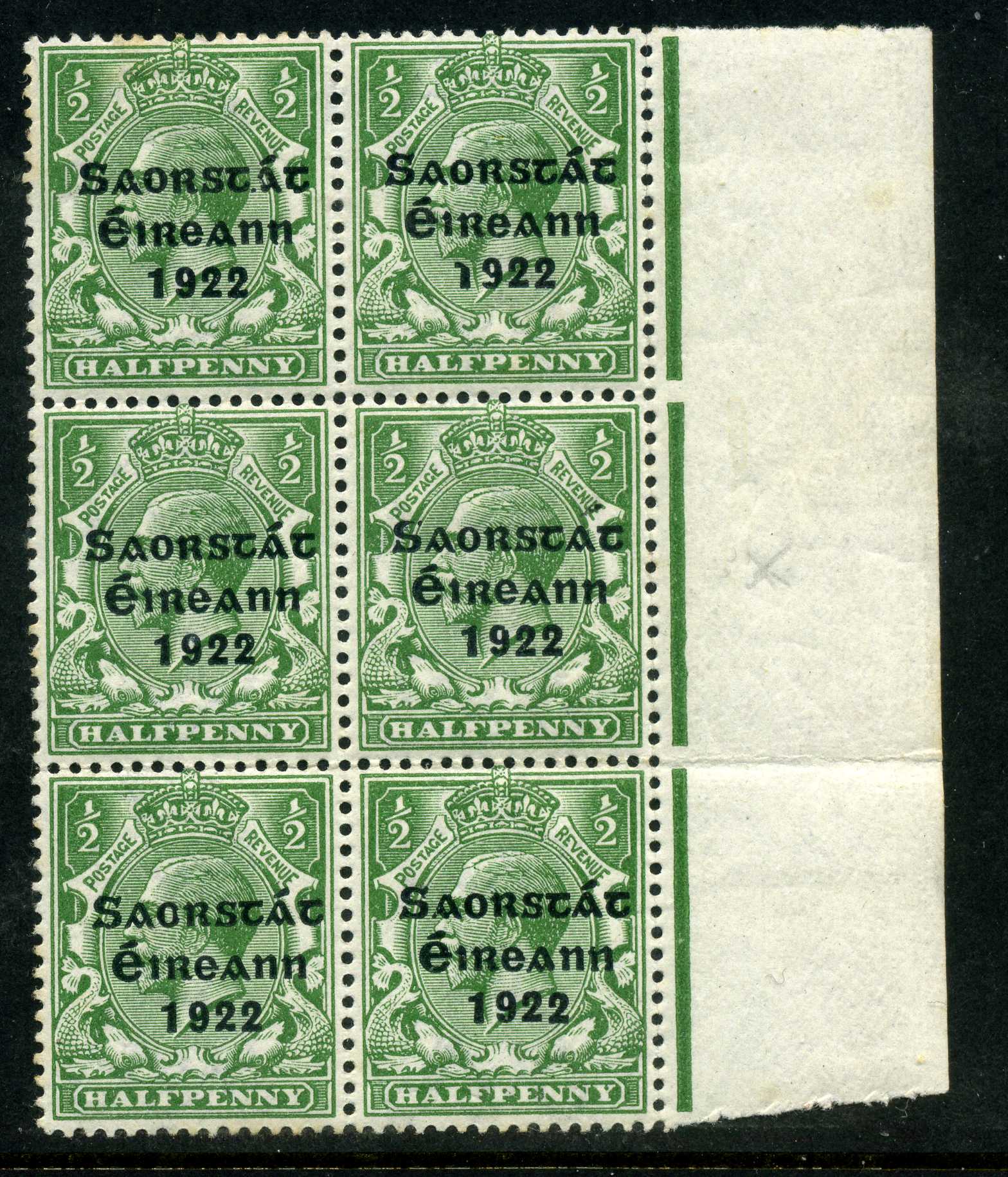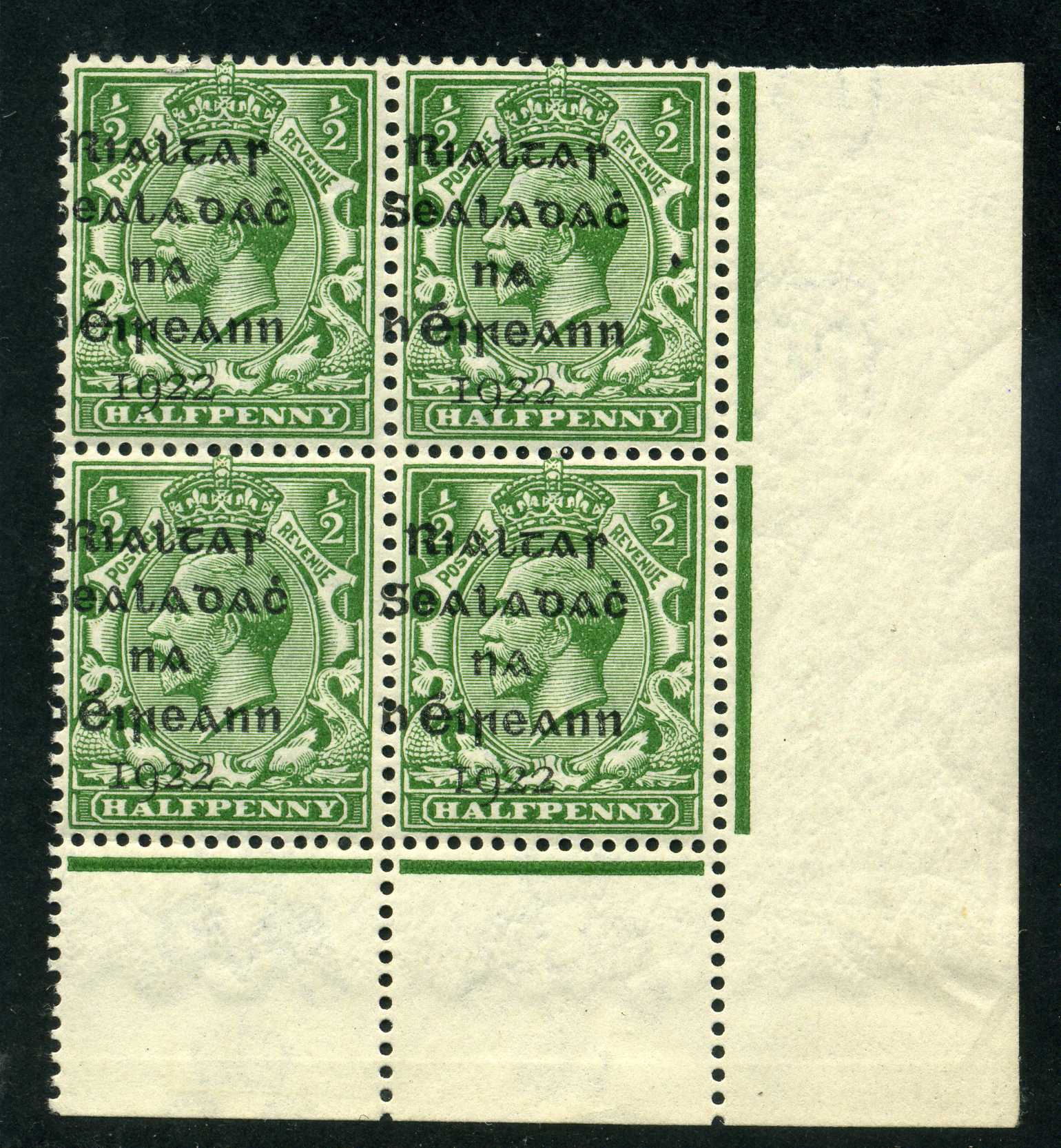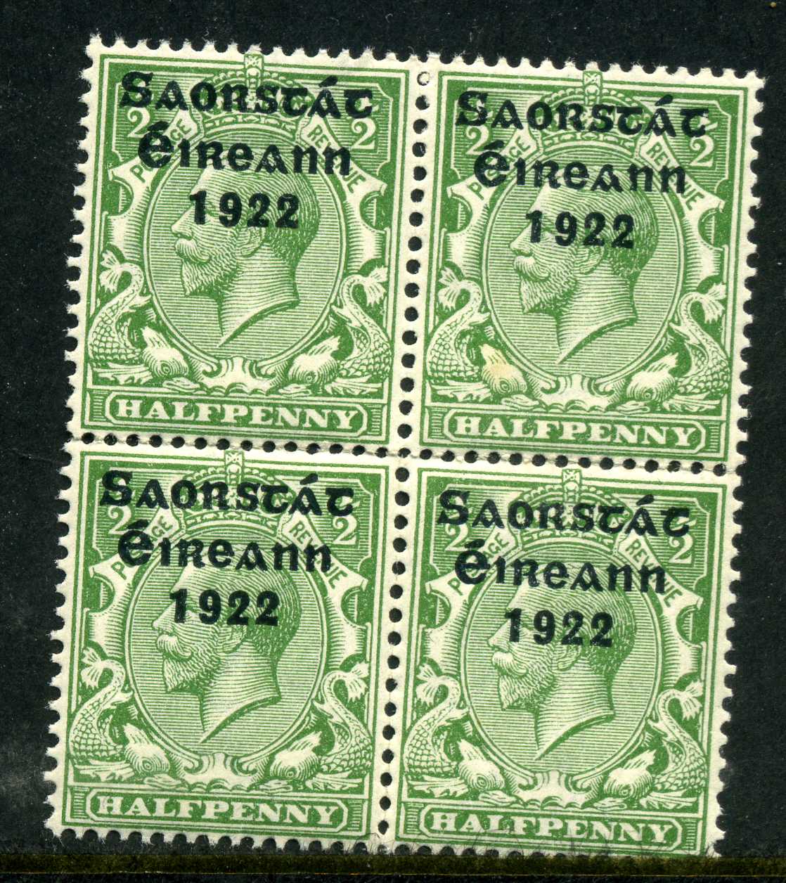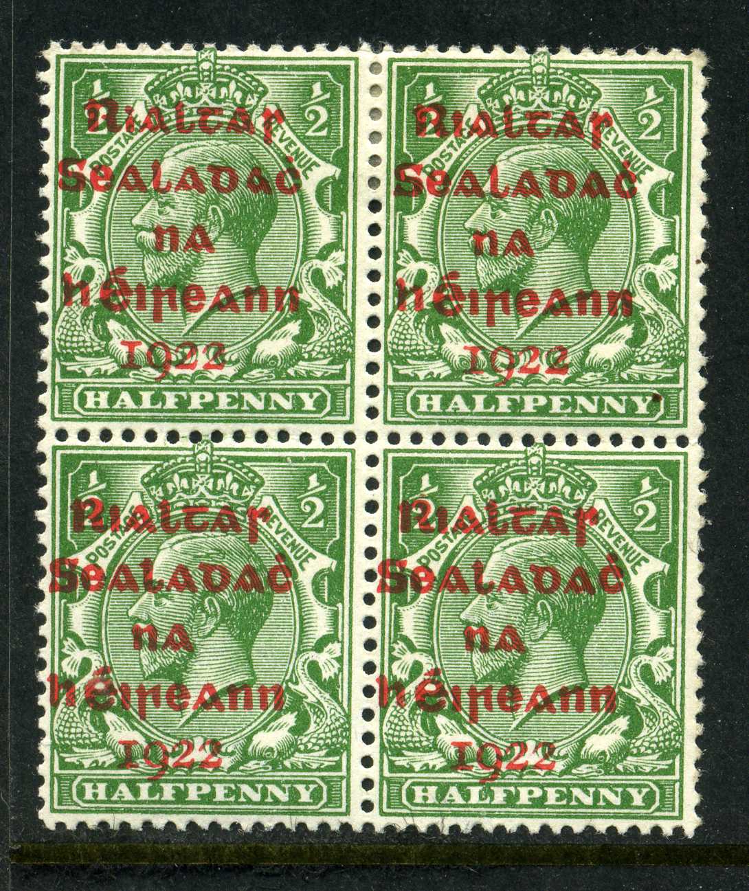 | 1922-3 Thom Saorstat ½d value unmounted mint block of four with overprint shifted to the very top of the stamp |