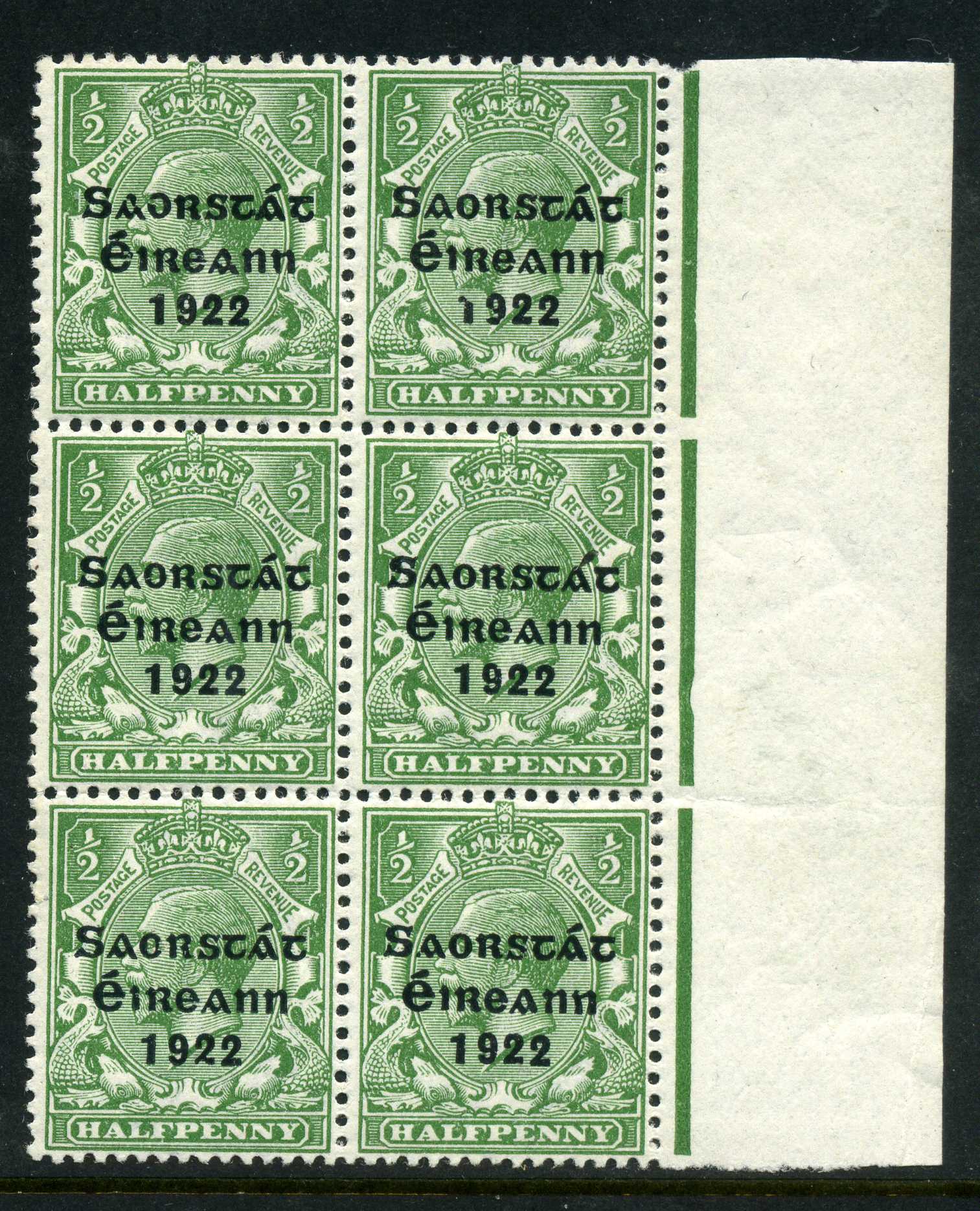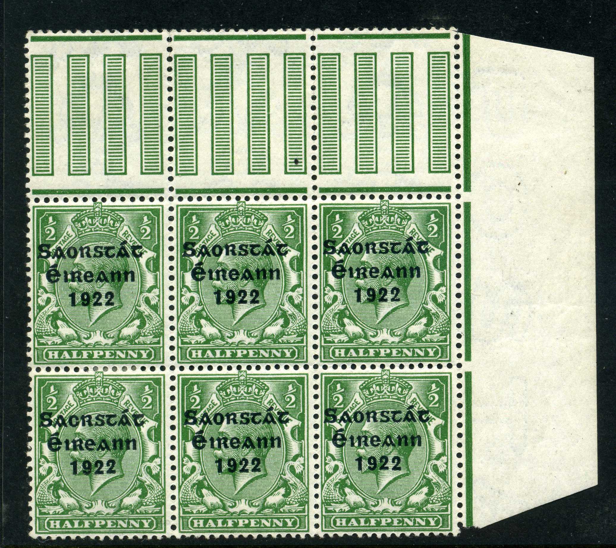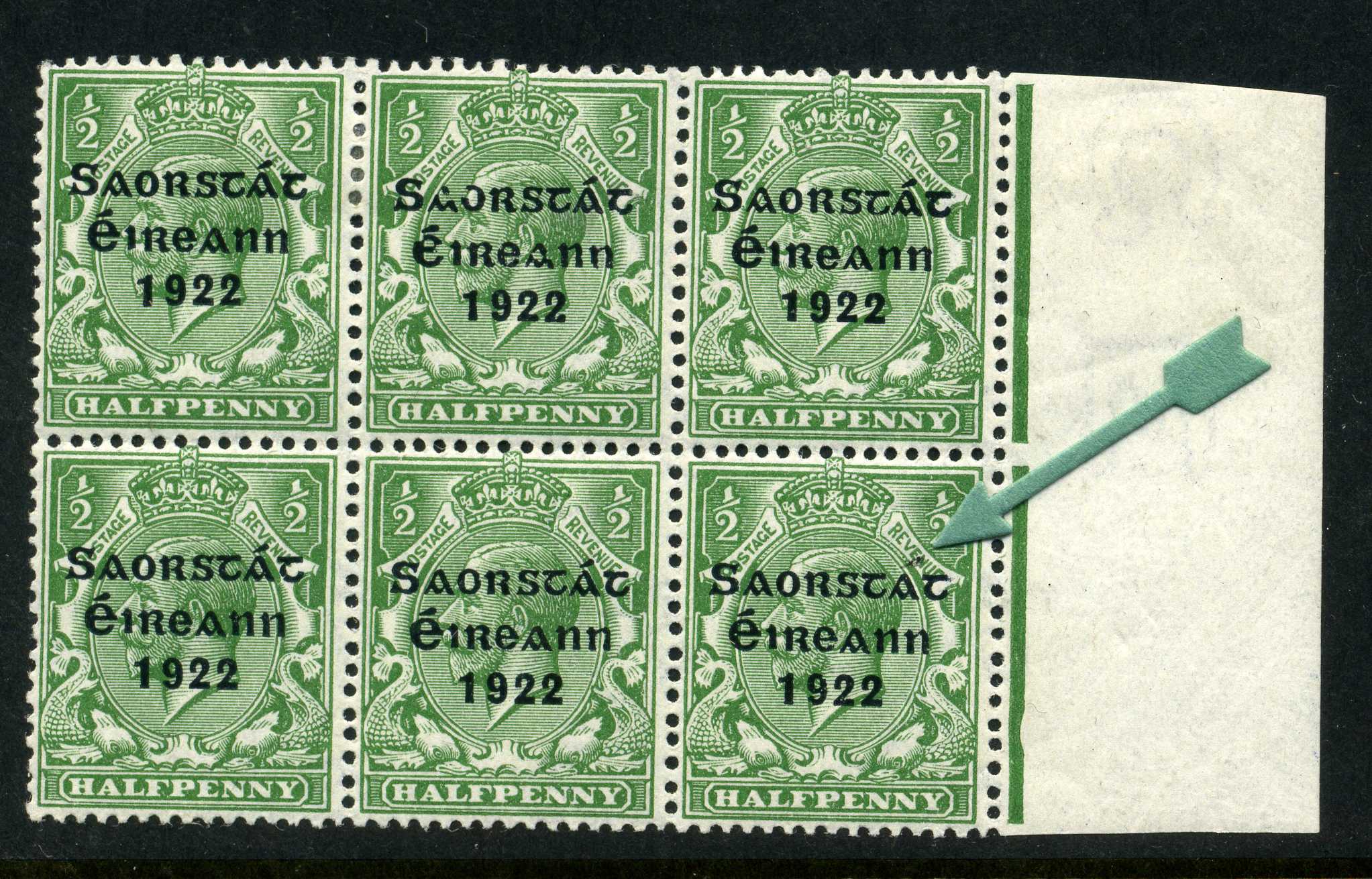 | 1922-3 Thom Saorstat ½d value unmounted mint block of four with overprint shifted to the very top of the stamp |