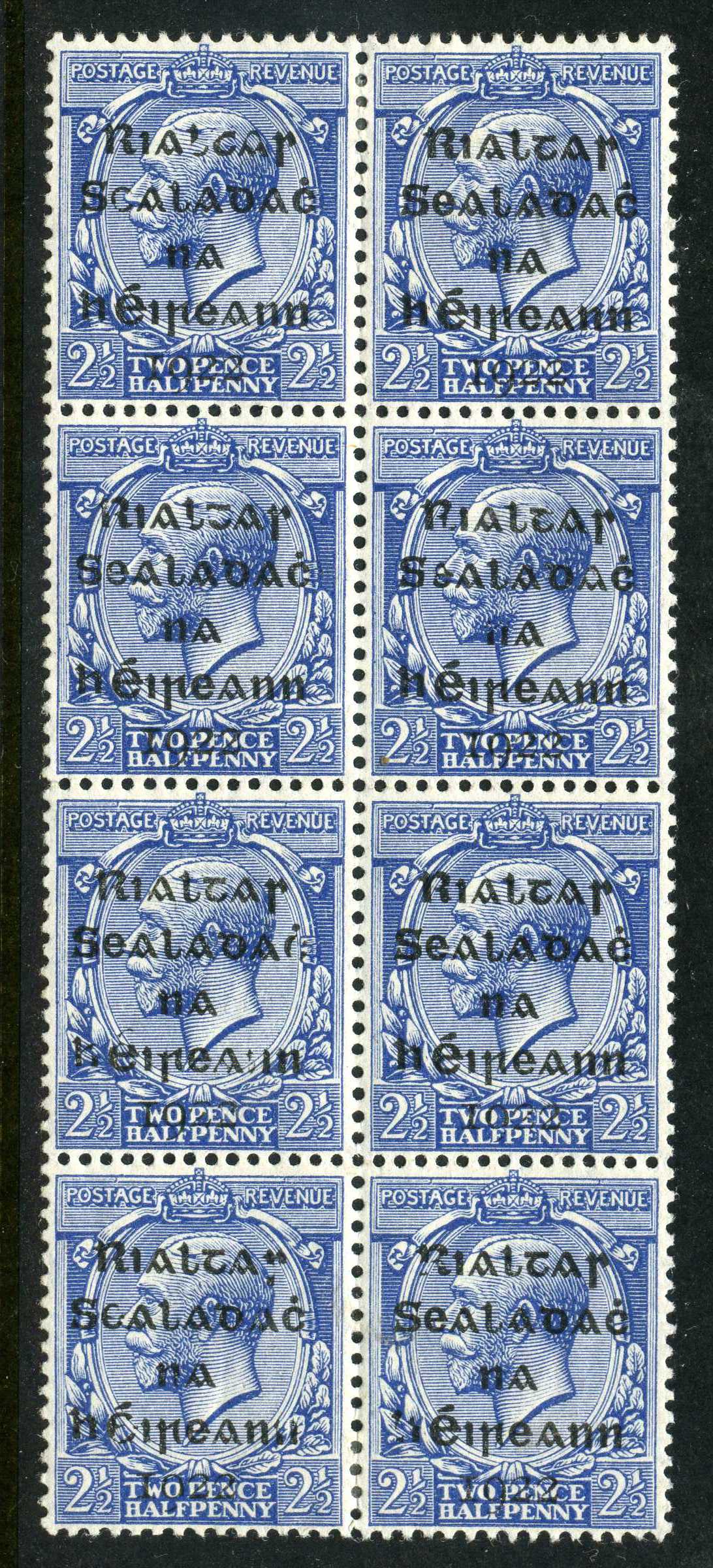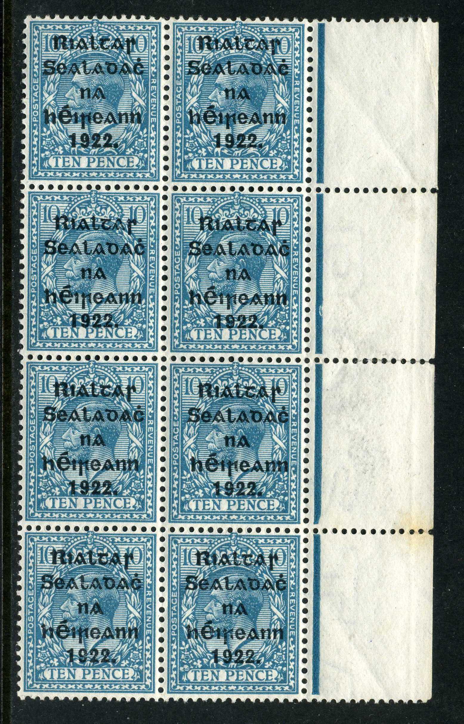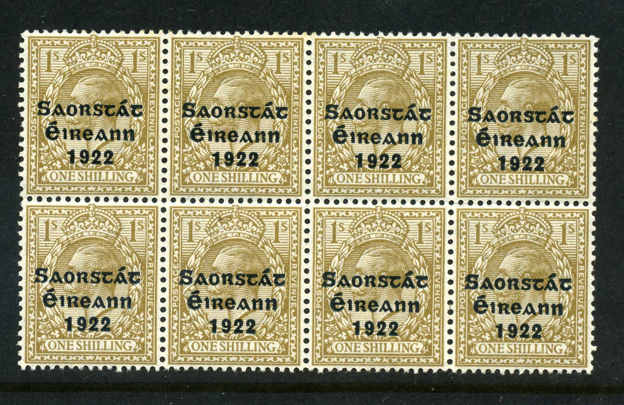 | 1922-3 Thom Saorstat 1 Shilling value unmounted mint block of 8 all with clear offset of overprint on reverse. |
