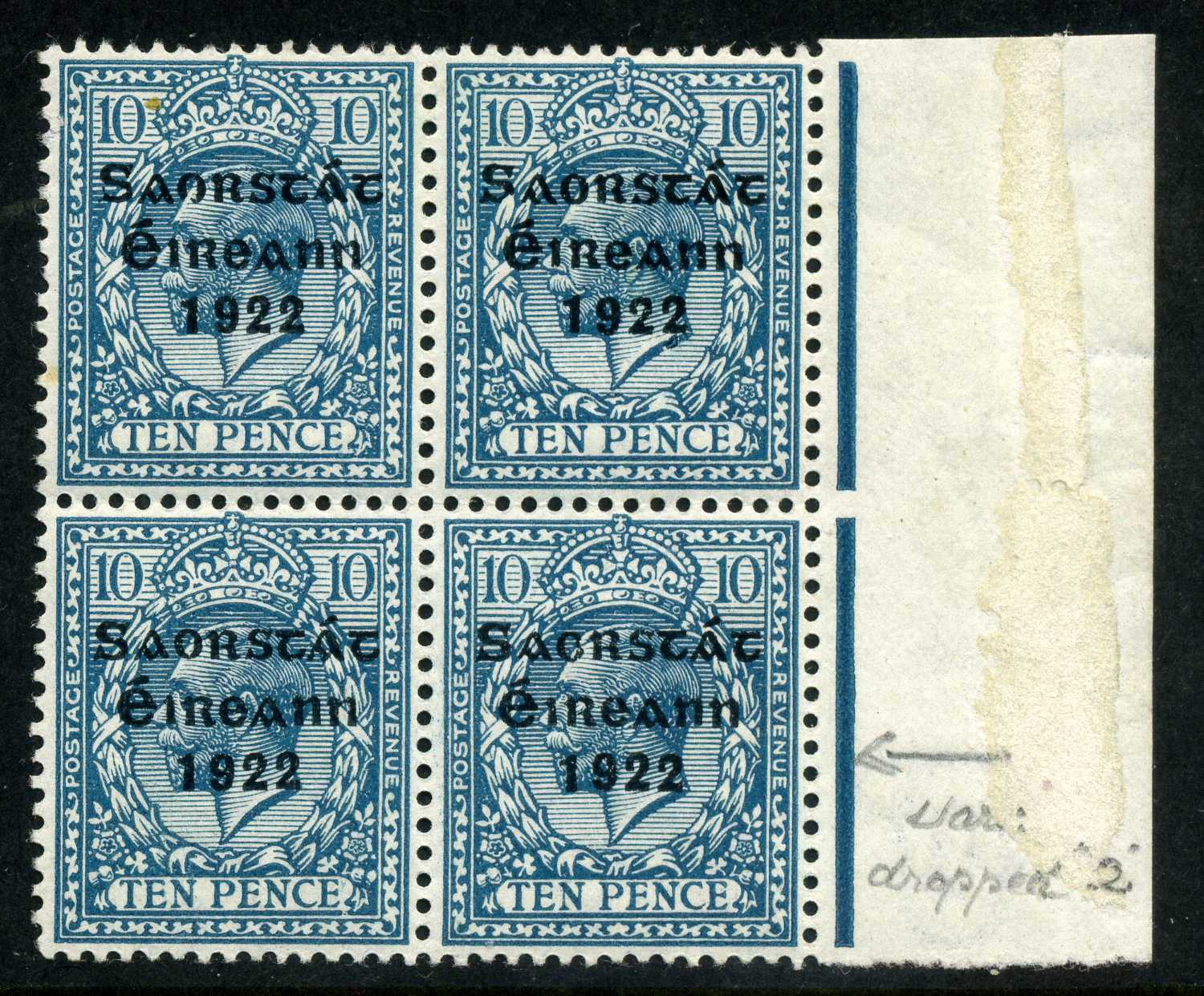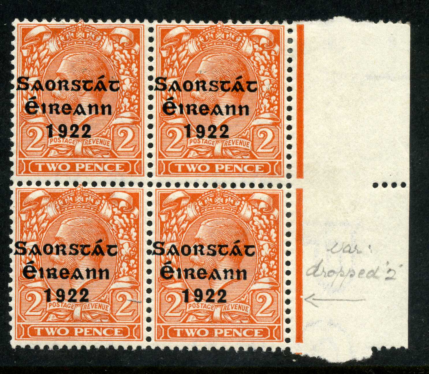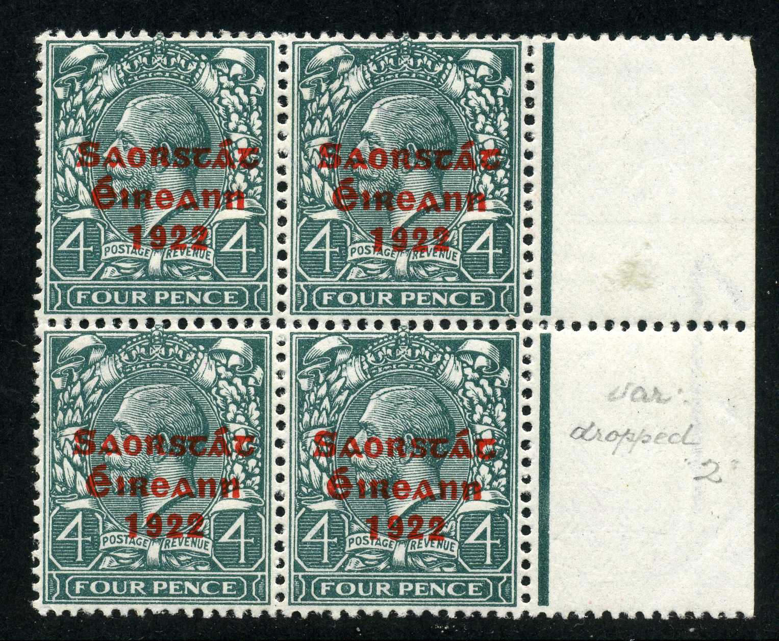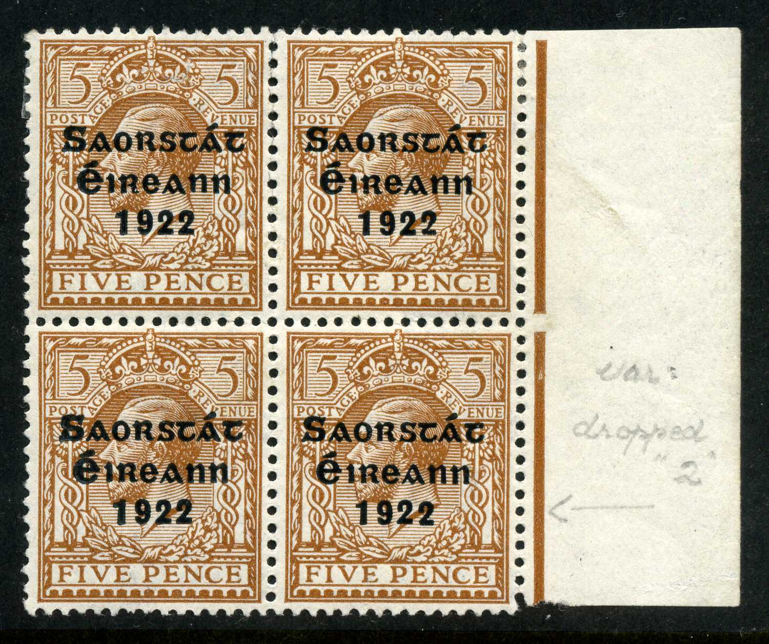 | 1922-3 Thom Saorstat 5d unmounted mint marginal block of 4 (1 hinged) lower right stamp with variety Dropped 2 in 1922. |