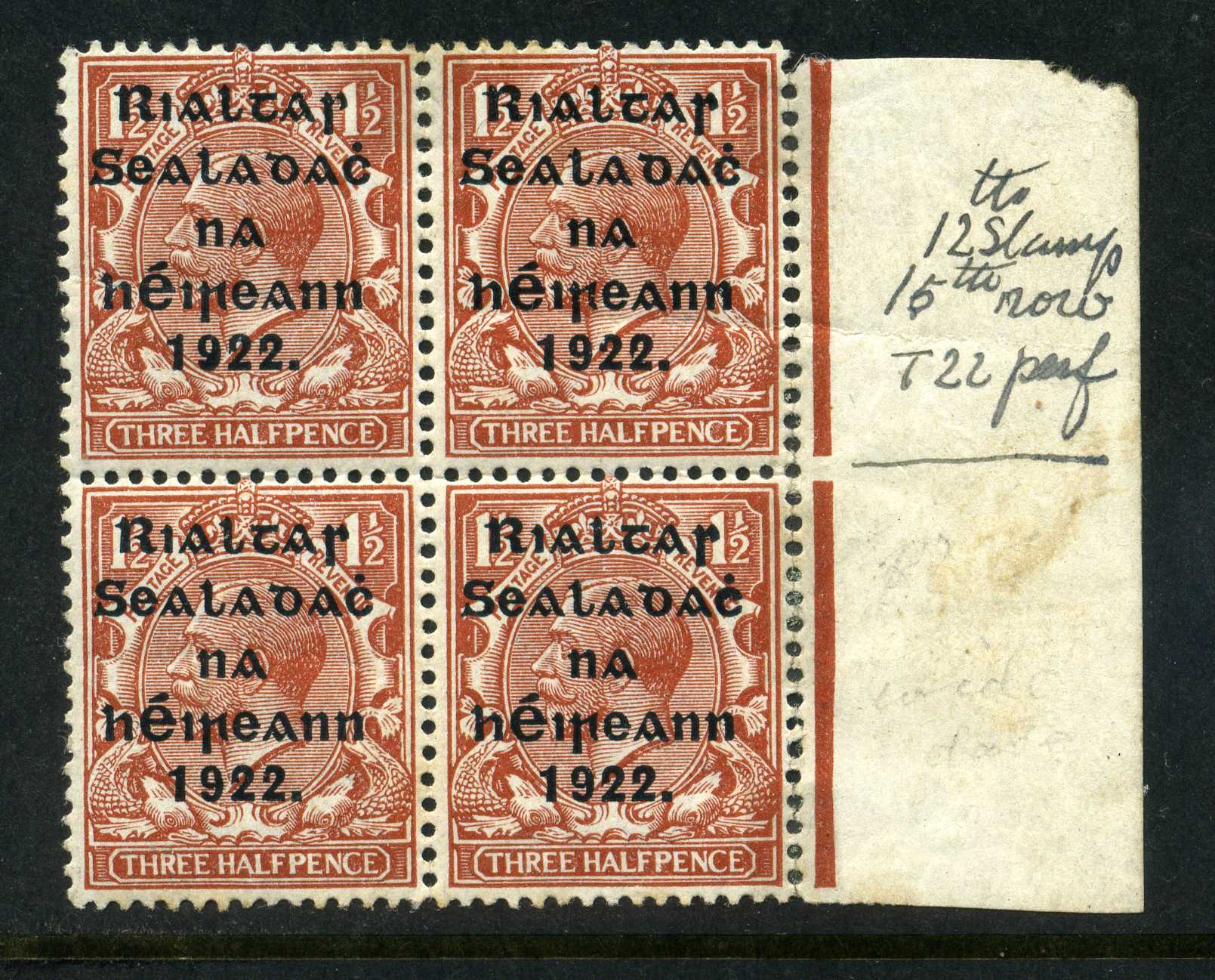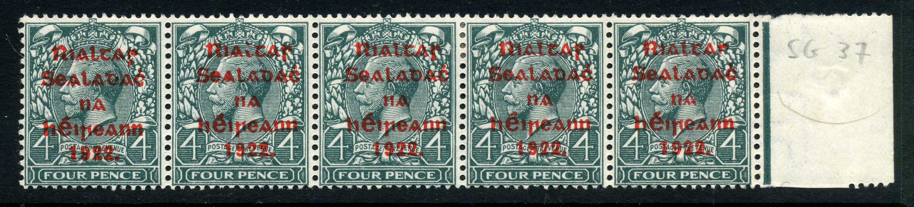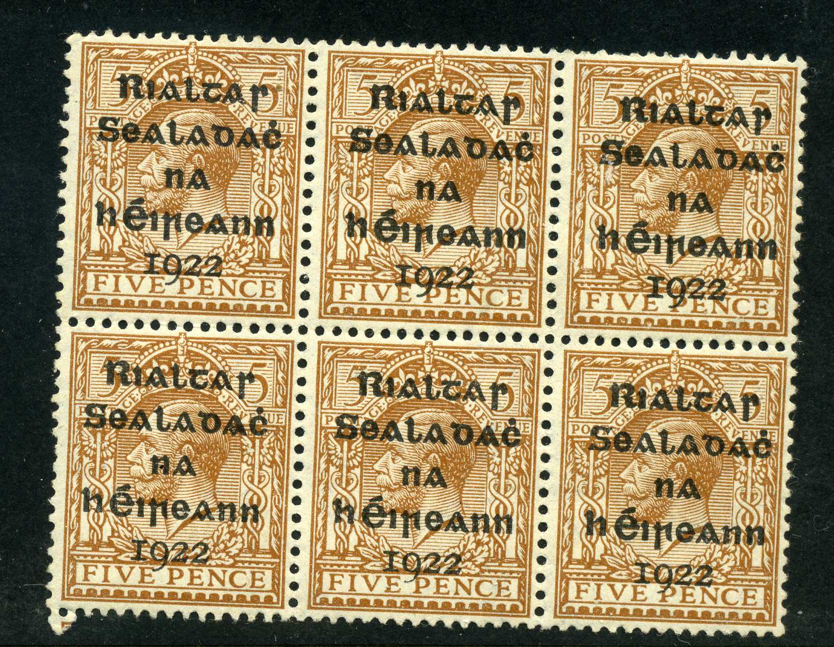 | 1922-3 Thom Saorstat 5d unmounted mint marginal block of 4 (1 hinged) lower right stamp with variety Dropped 2 in 1922. |