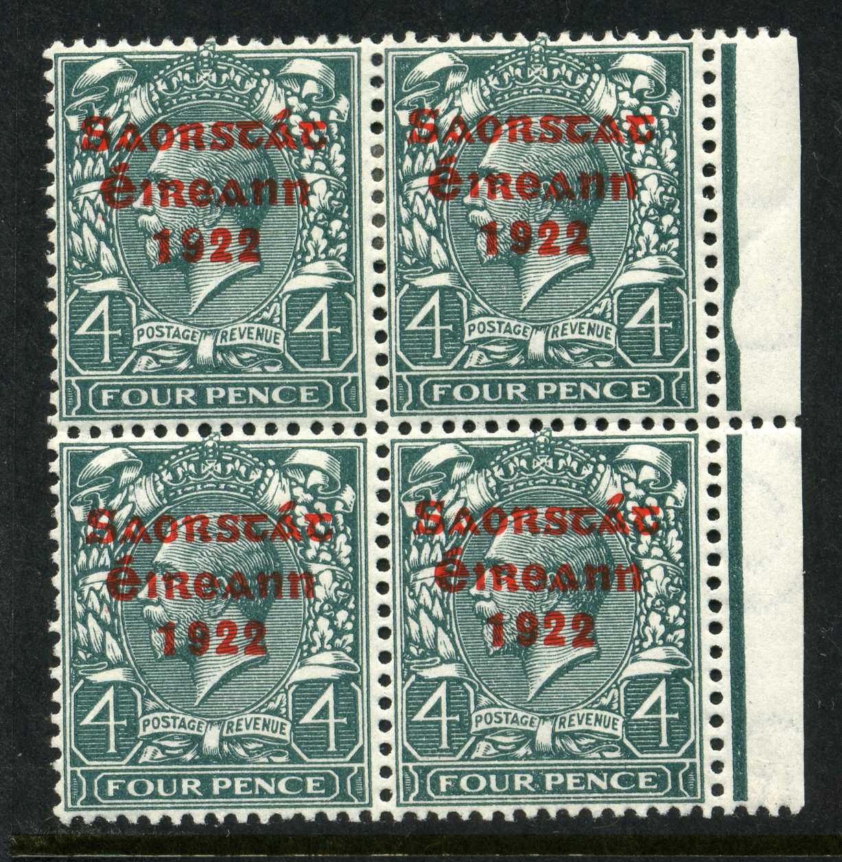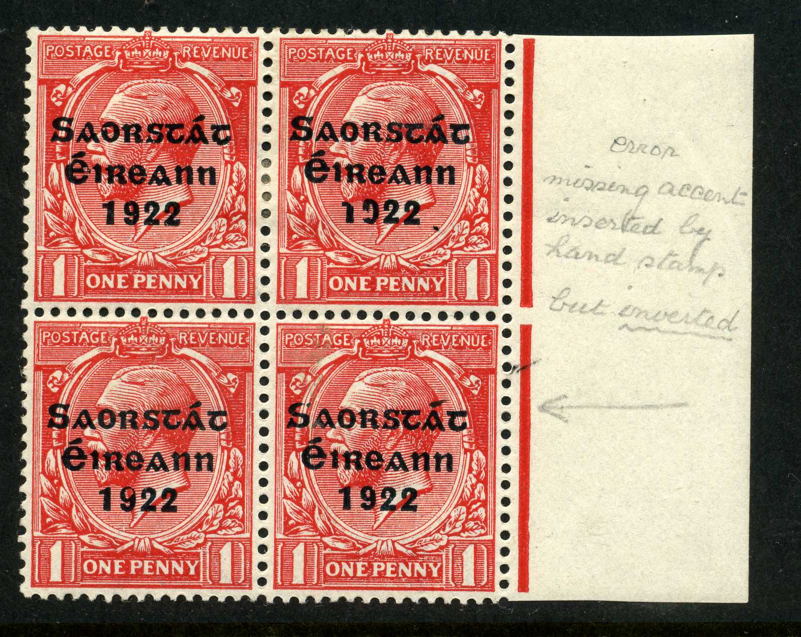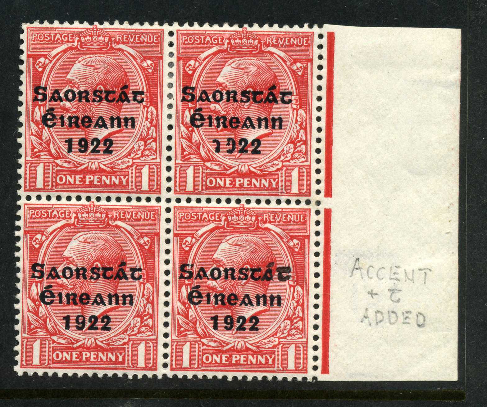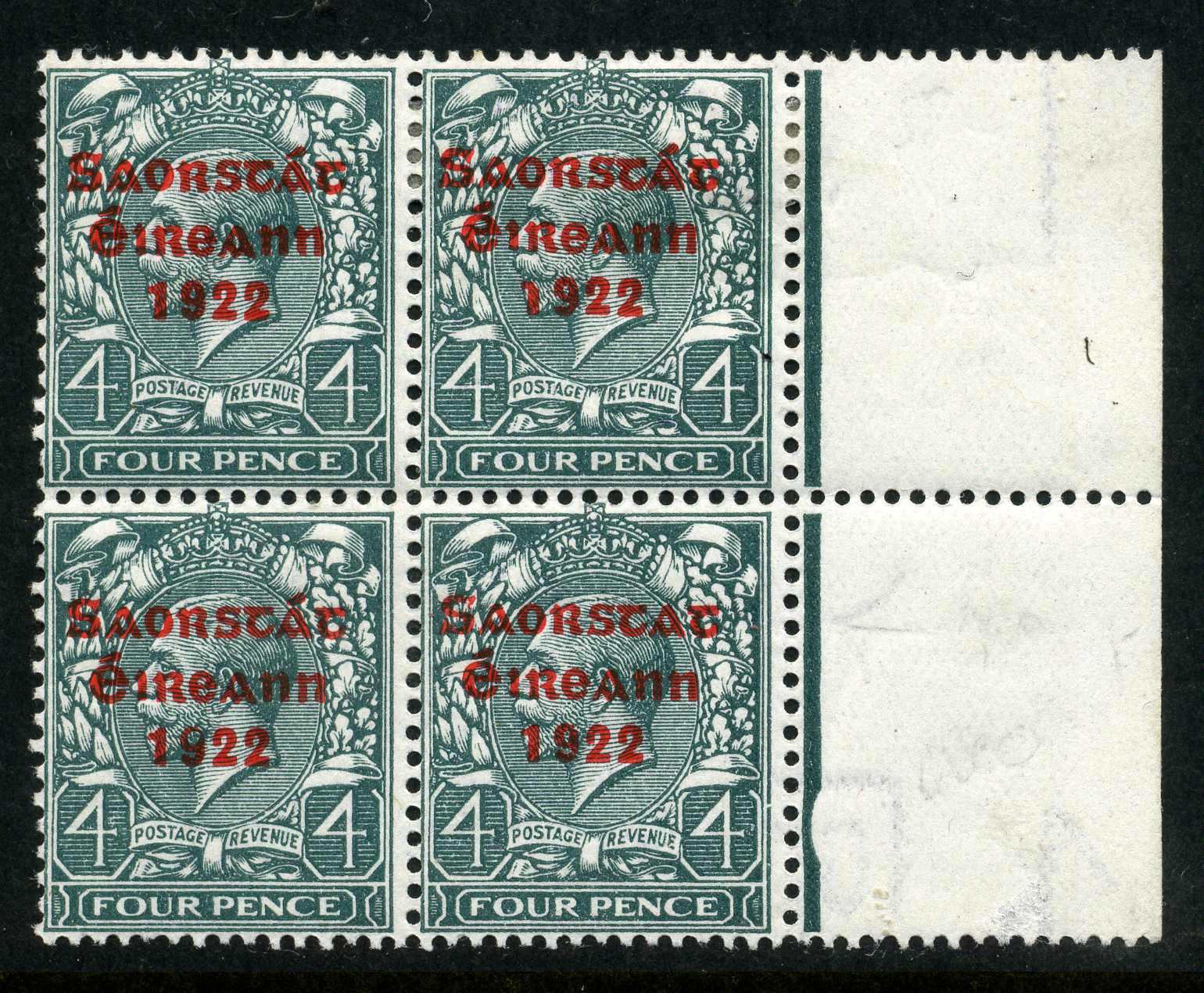 | 1922-3 Thom Saorstat 4d value fine mint marginal block of 4 one stamp with Missing Accent |