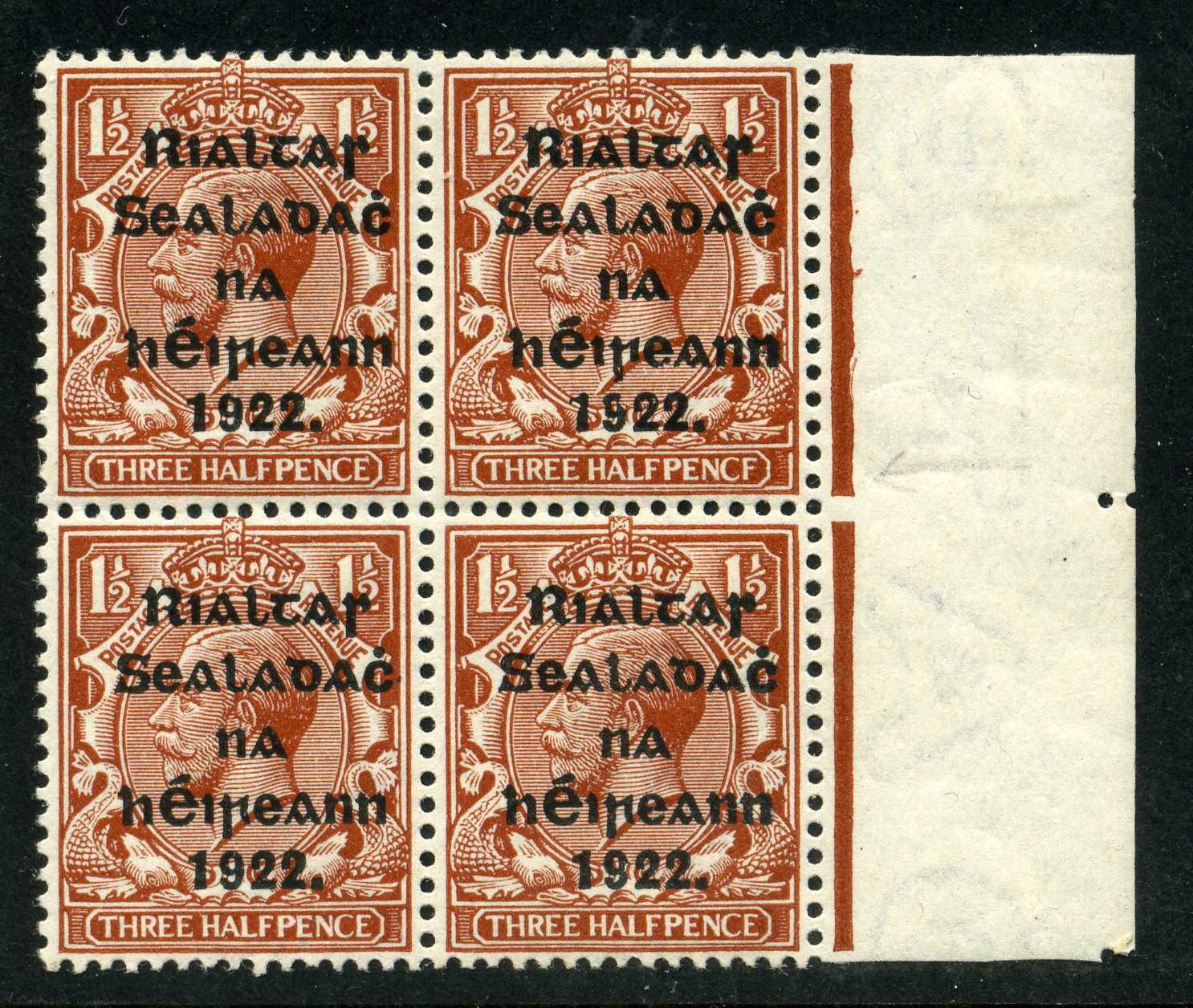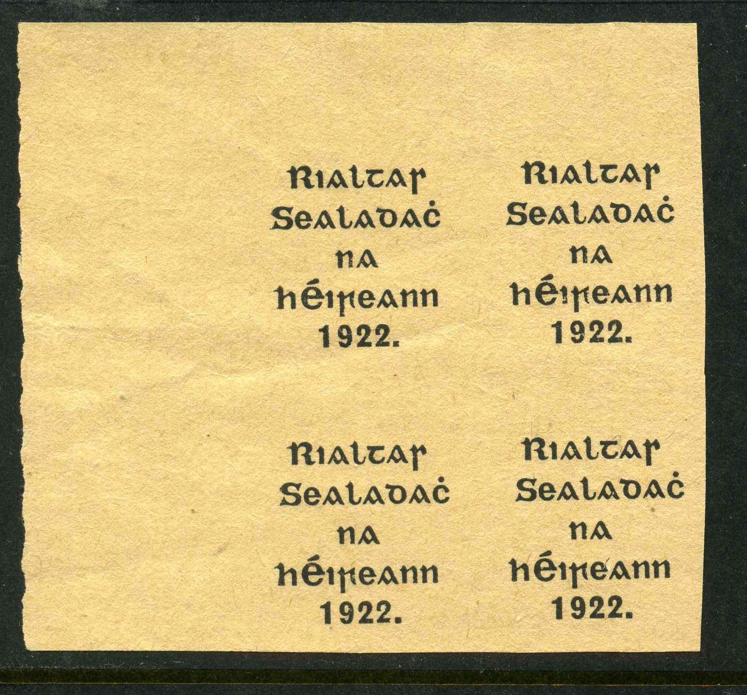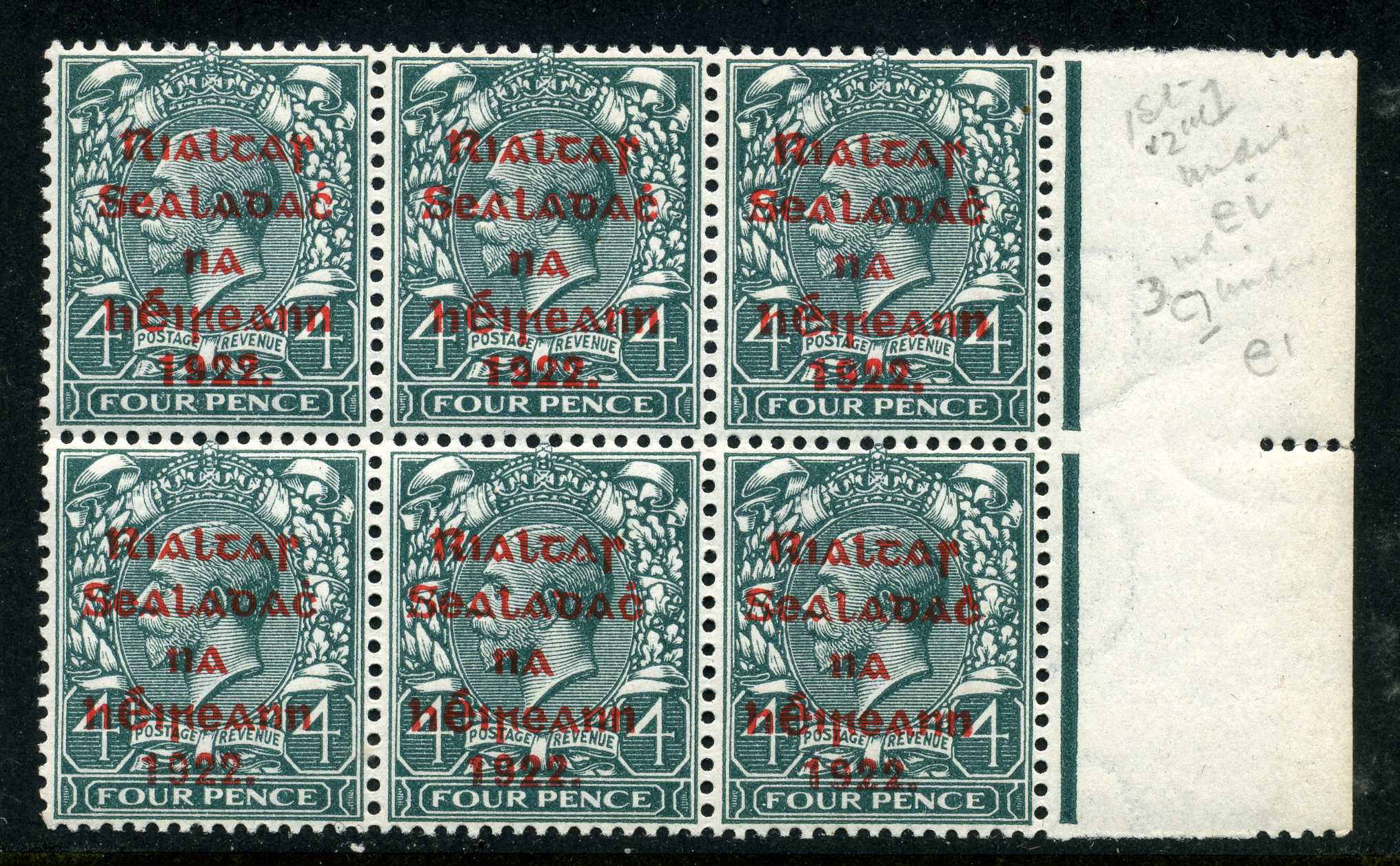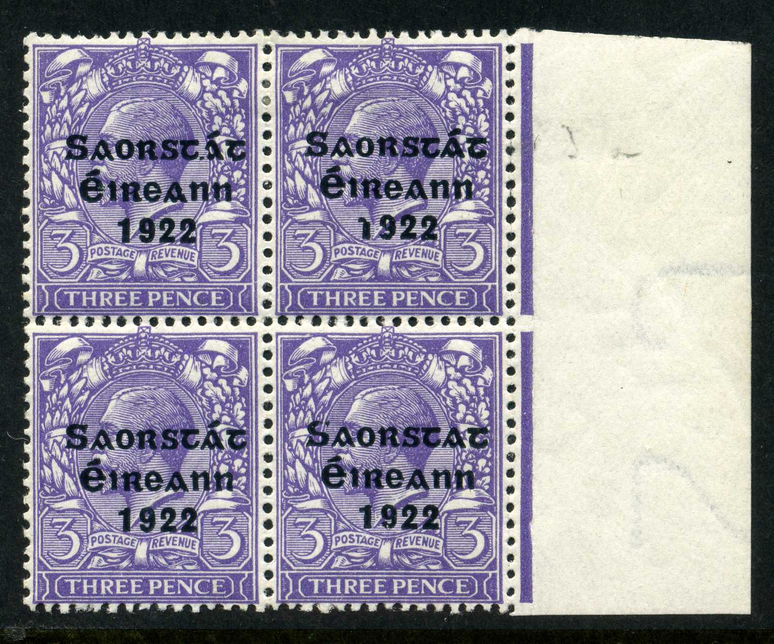 | 1922-3 Thom Saorstat 4d value fine mint marginal block of 4 one stamp with Missing Accent |