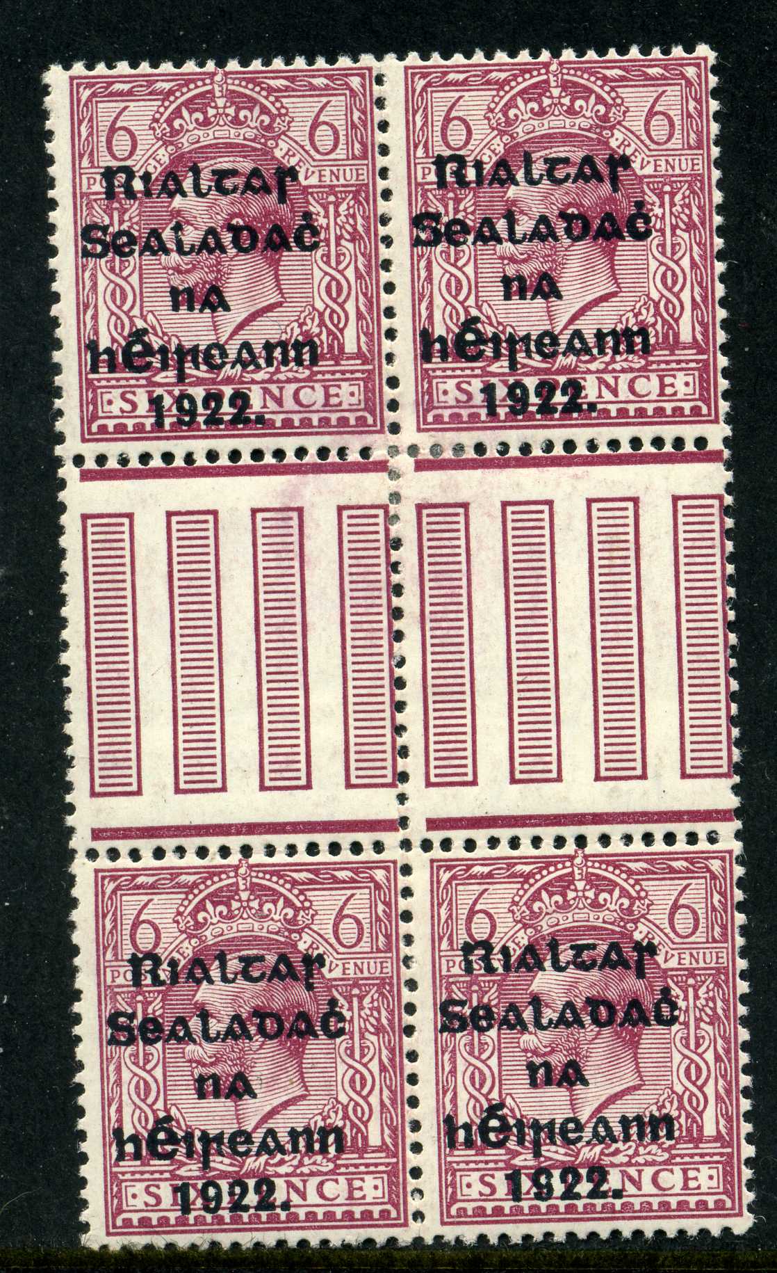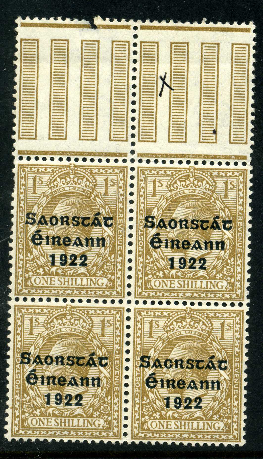 | 1922-3 Thom Saorstat 1 shilling value unmounted mint Gutter marginal block of 4 lower right stamp with SACrstat variety. |