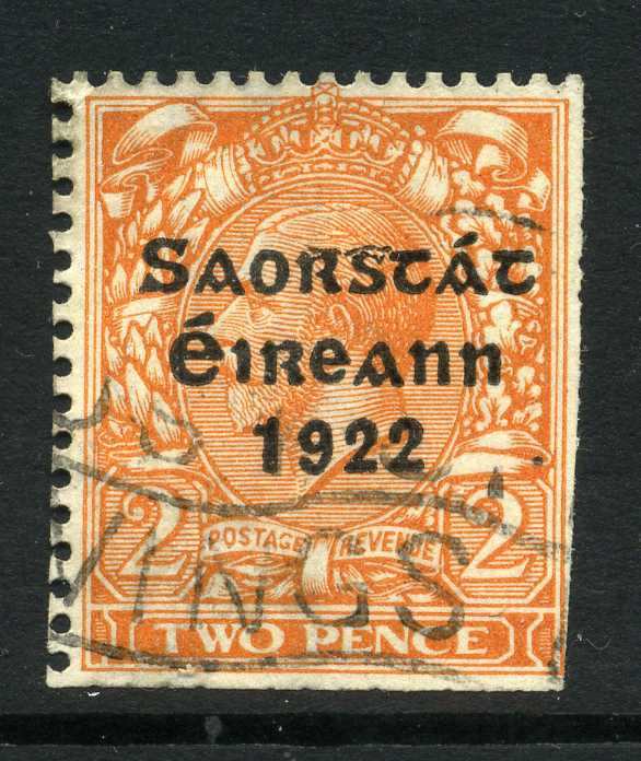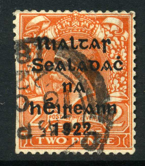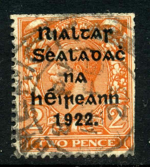 | 1923 Harrison Three Line Coil 2d value used with variety Curved Line over second S of Saorstat. |