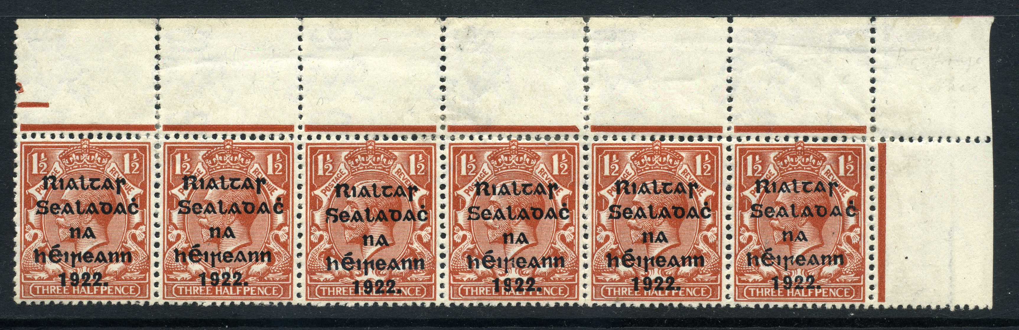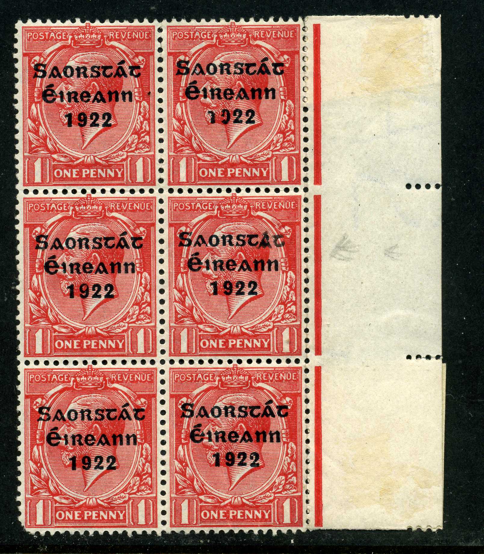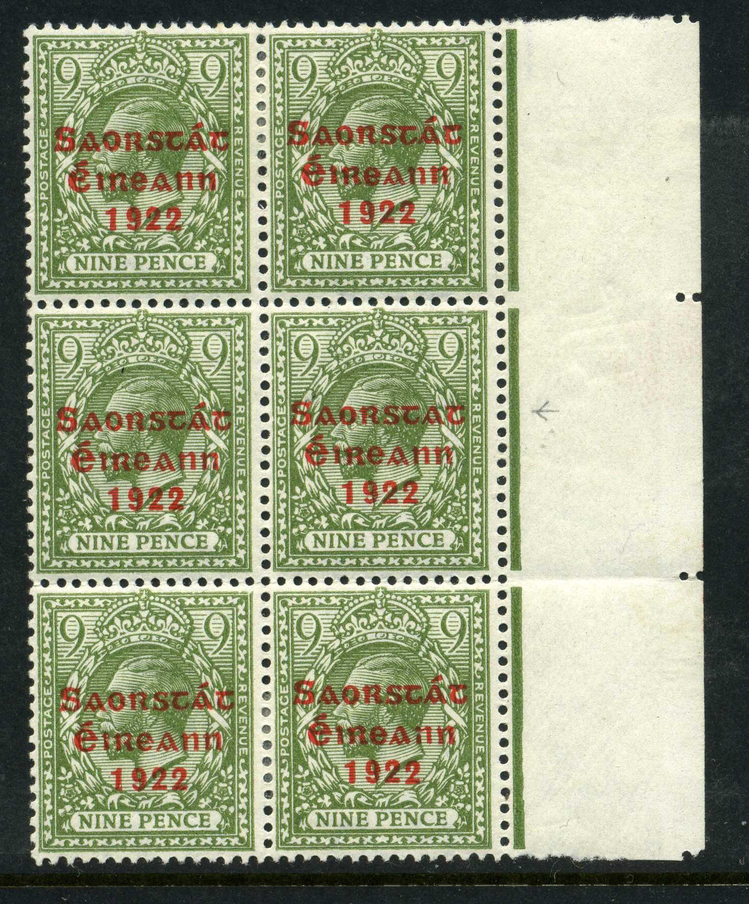 | 1922-3 Thom Saorstat 9d fine mint marginal block of 6 upper and lower marginal stamps with Dropped 2 and centre marginal stamp with Missing Accent. |
