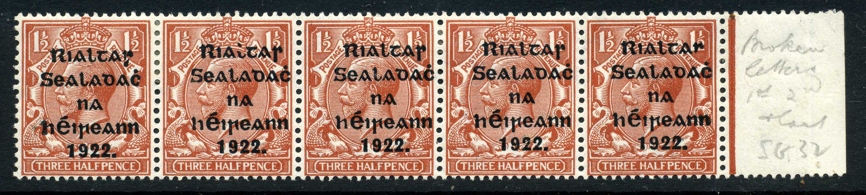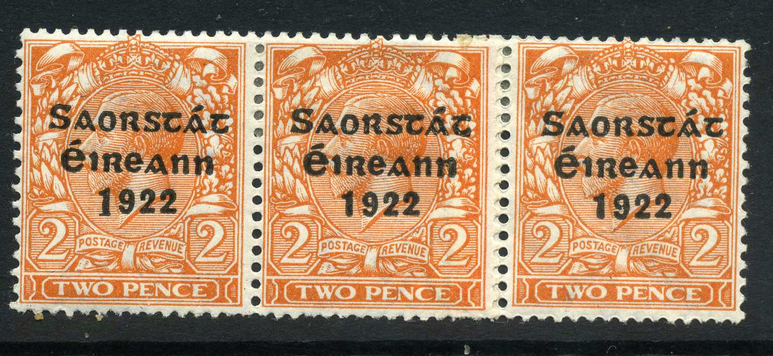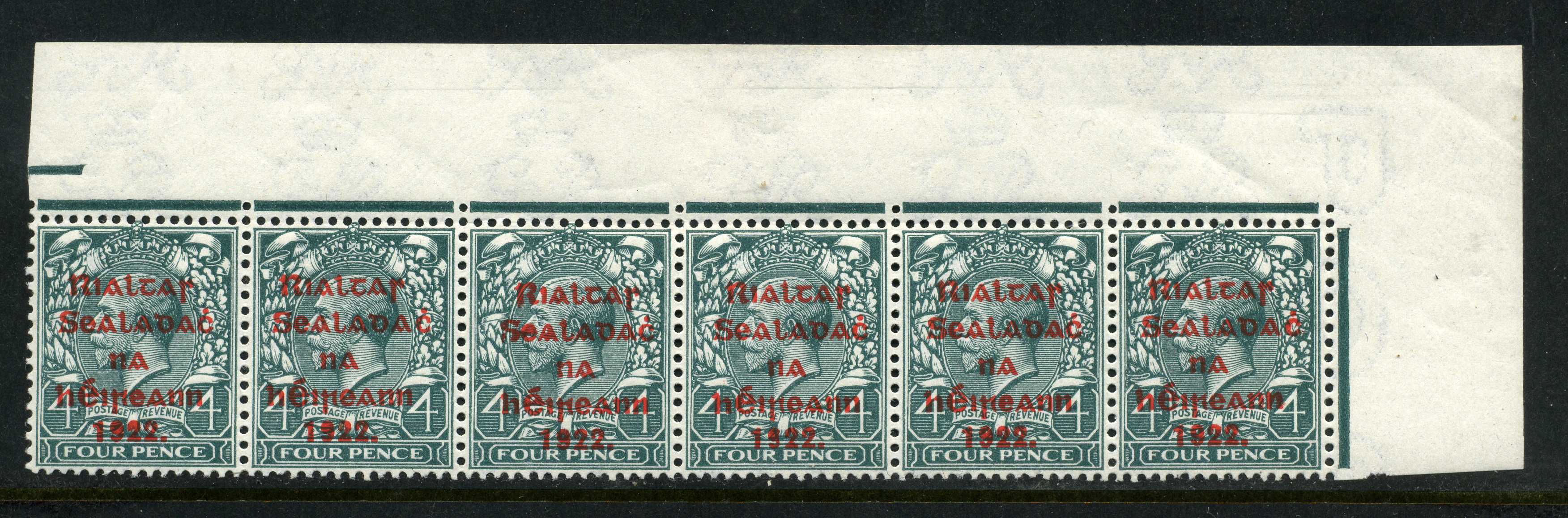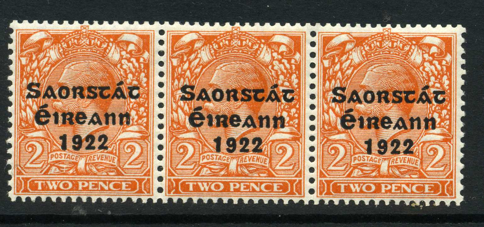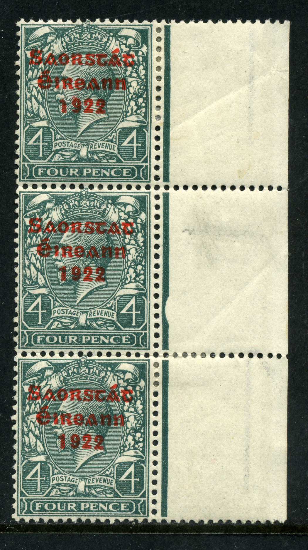 | 1922-3 Thom Saorstat 4d value unmounted mint marginal strip of 3 centre stamp with variety Accent Missing. |