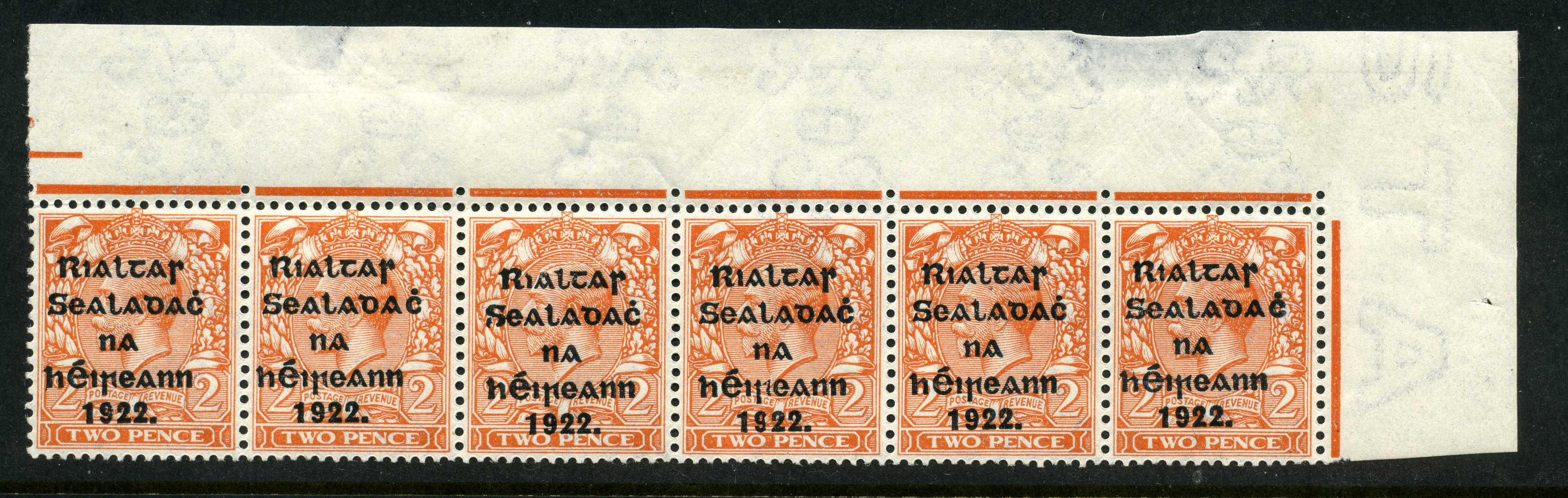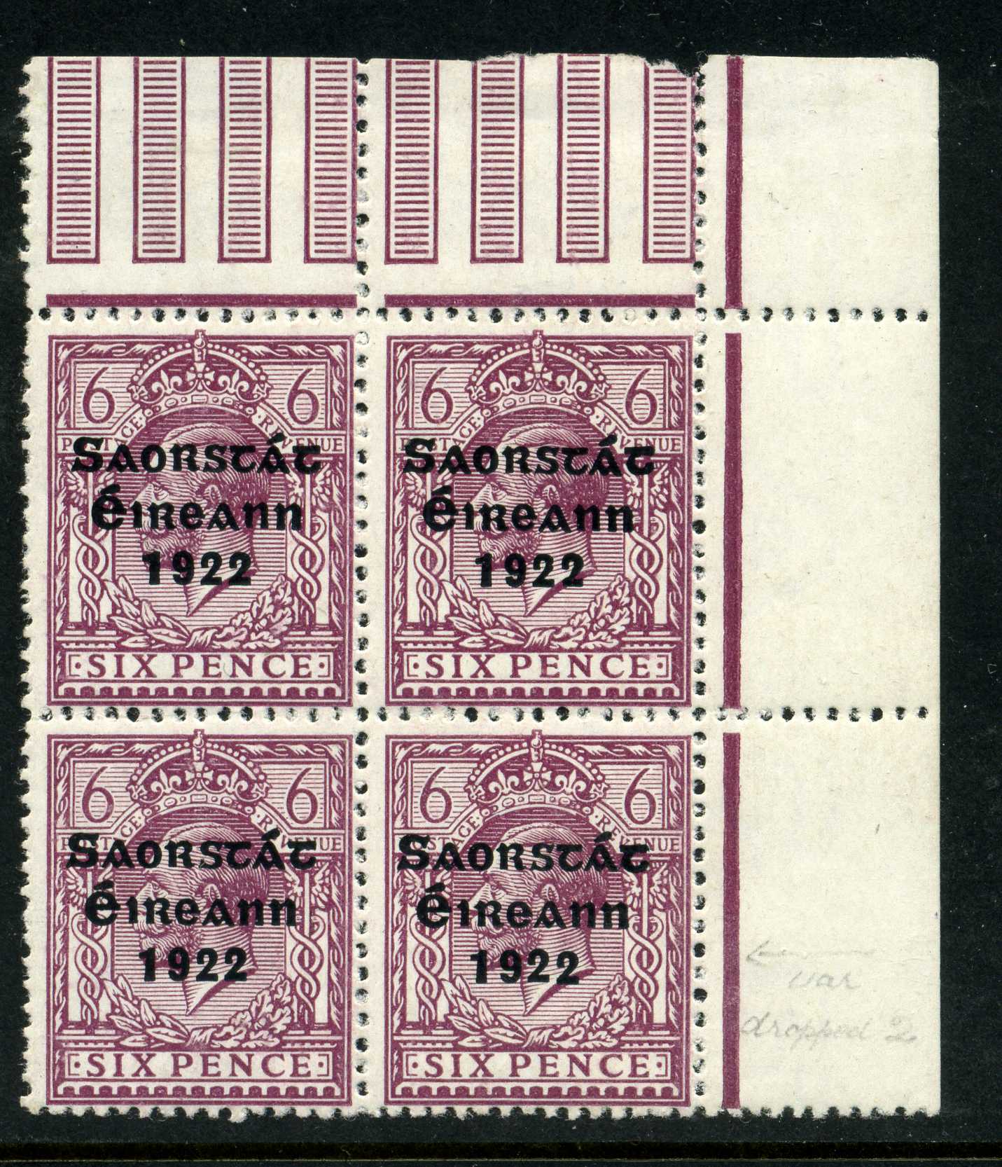 | 1922-3 Thom Saorstat 6d unmounted mint top right corner block of 4 lower right stamp with variety Dropped 2 in 1922. |