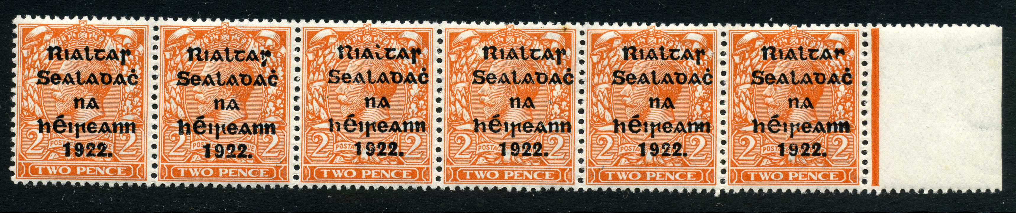 | 1922-3 Thom Saorstat 9d value right marginal strip of 4 (2 mint 2 unmounted) one stamp with variety Line over Saorstat. |