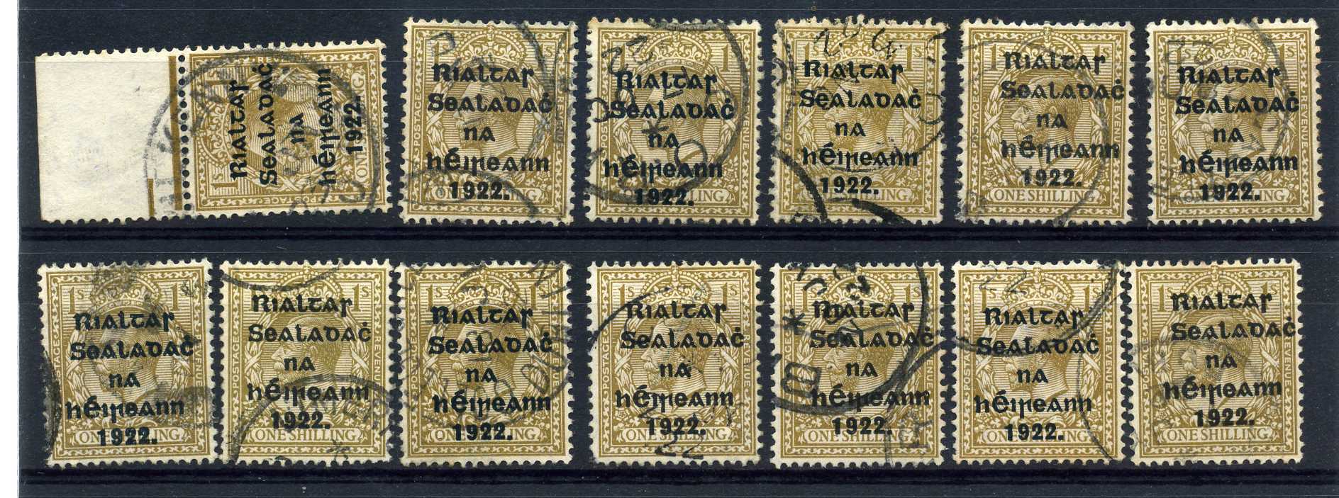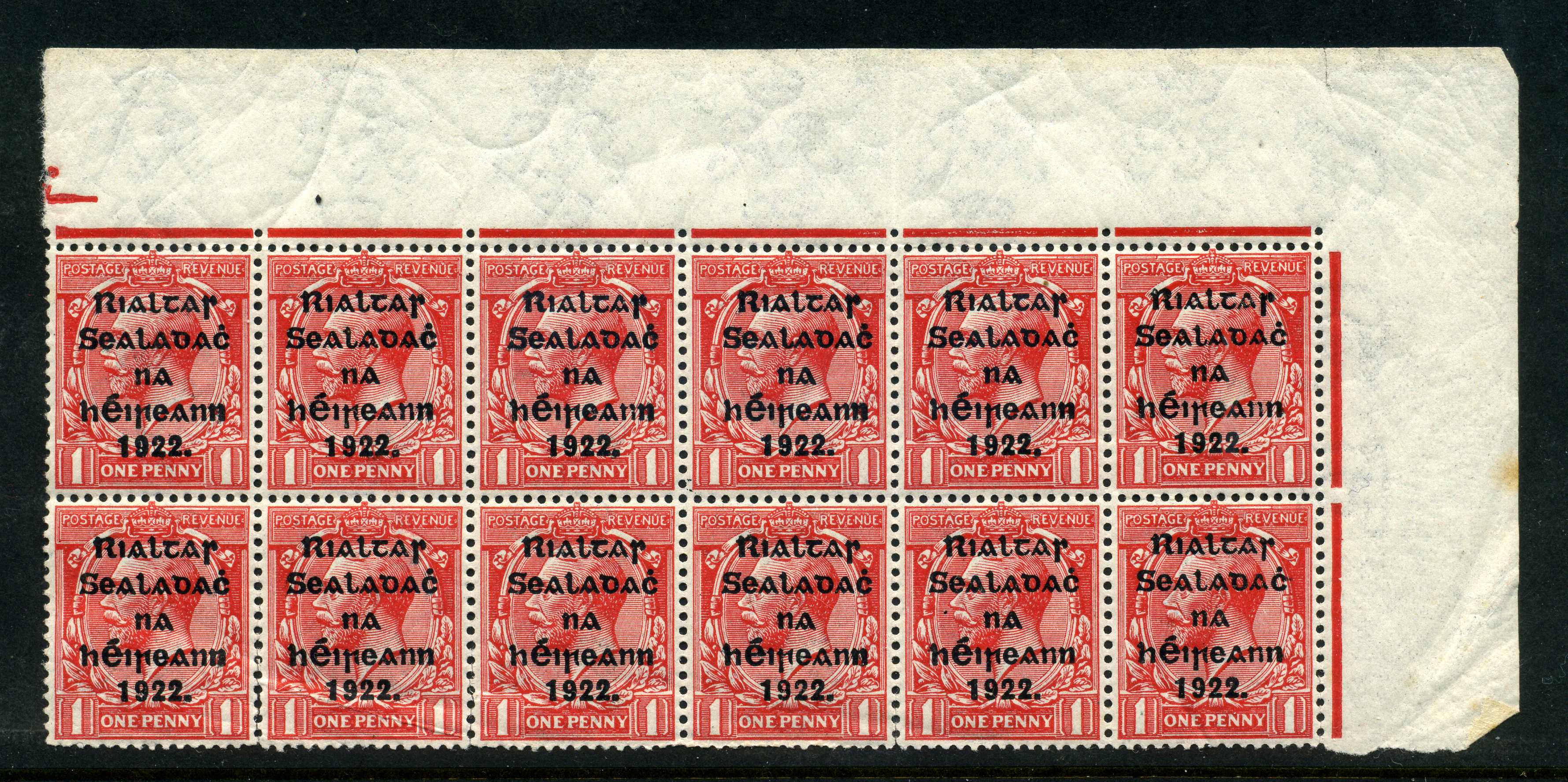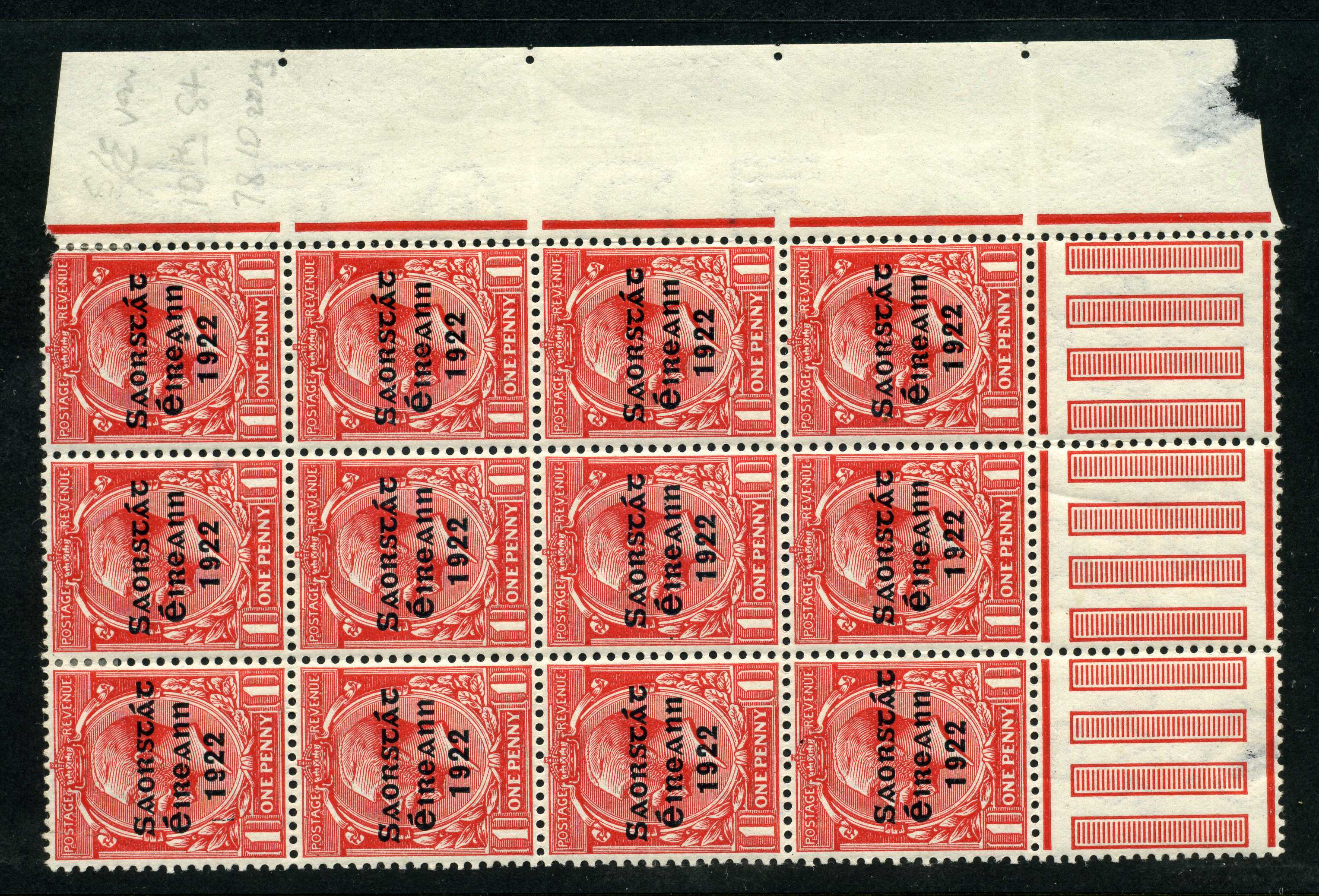 | 1922-3 Thom Saorstat 1 shilling value unmounted mint block of 12 all with clear offset of overprint on reverse. |