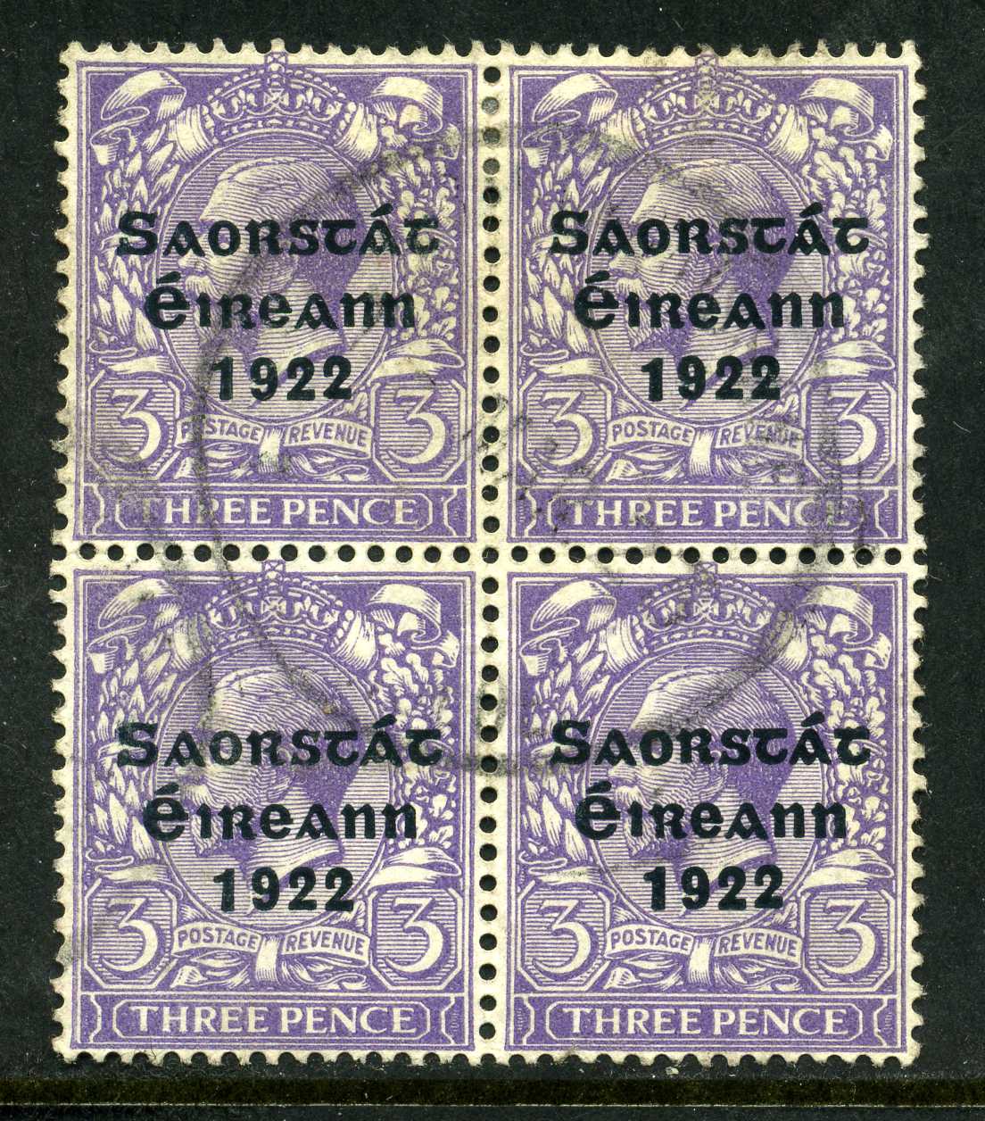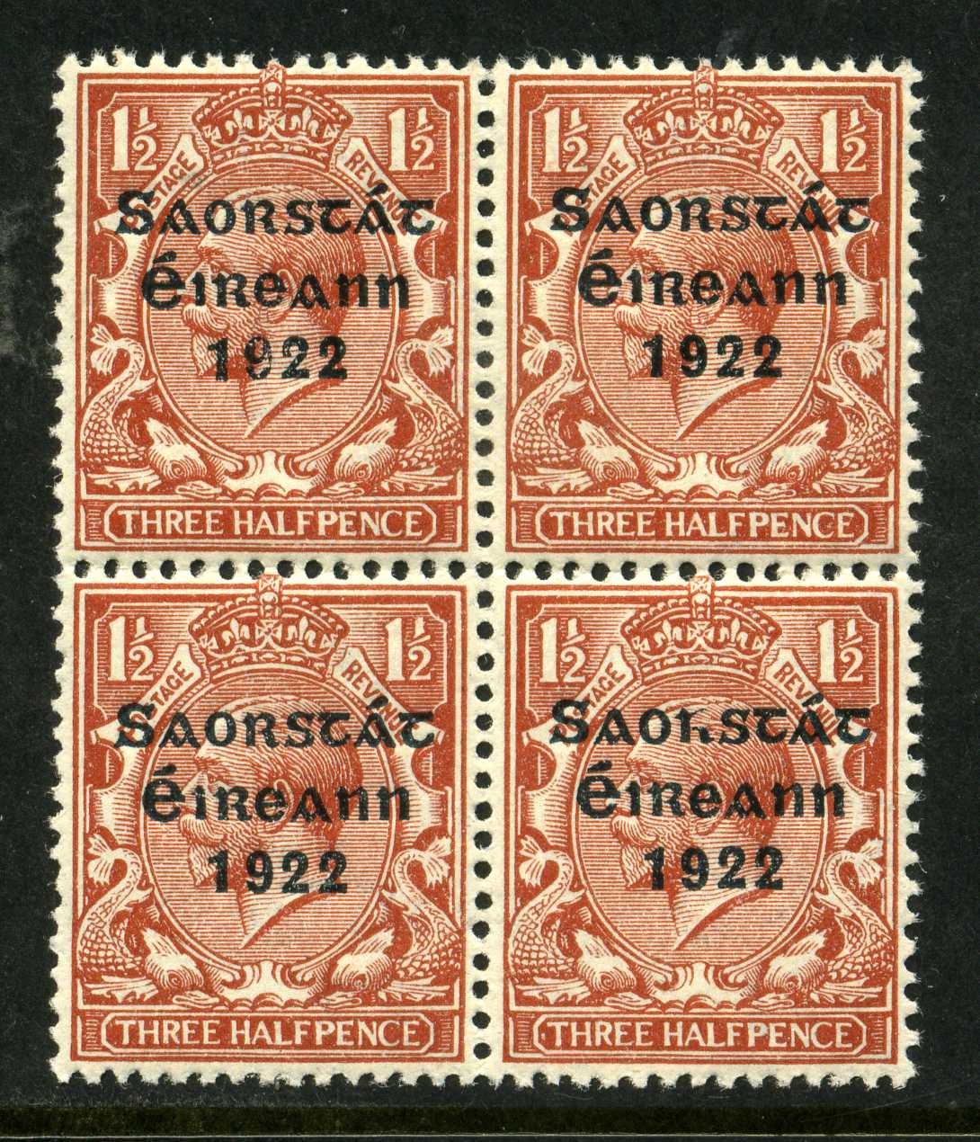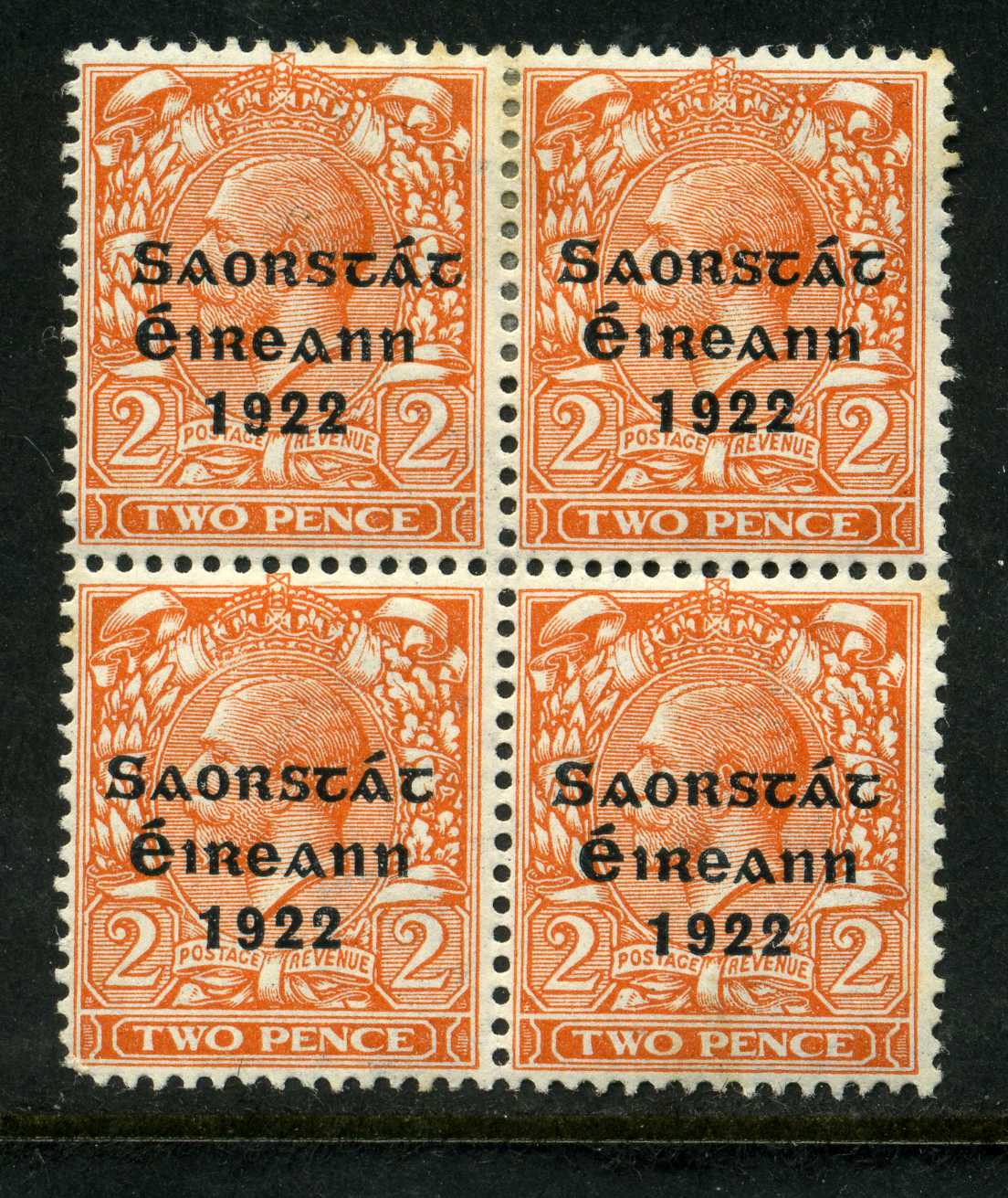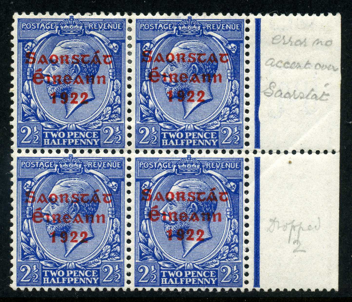 | 1922-3 Thom Saorstat 4d mint block of 4 one stamp with variety Accent Missing. |