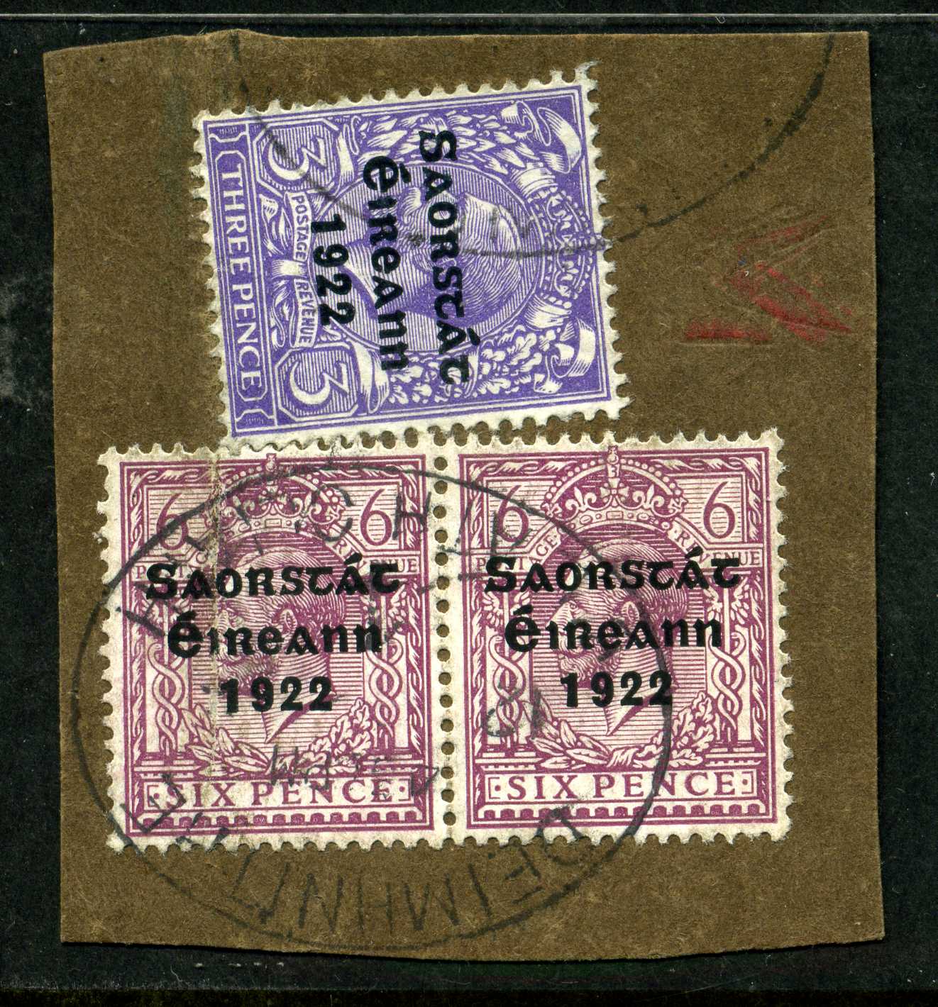 | 1922-3 Thom Saorstat 6d pair and 3d single used on piece and tied by very fine strike of reg oval "Baile Atha Cliath". |