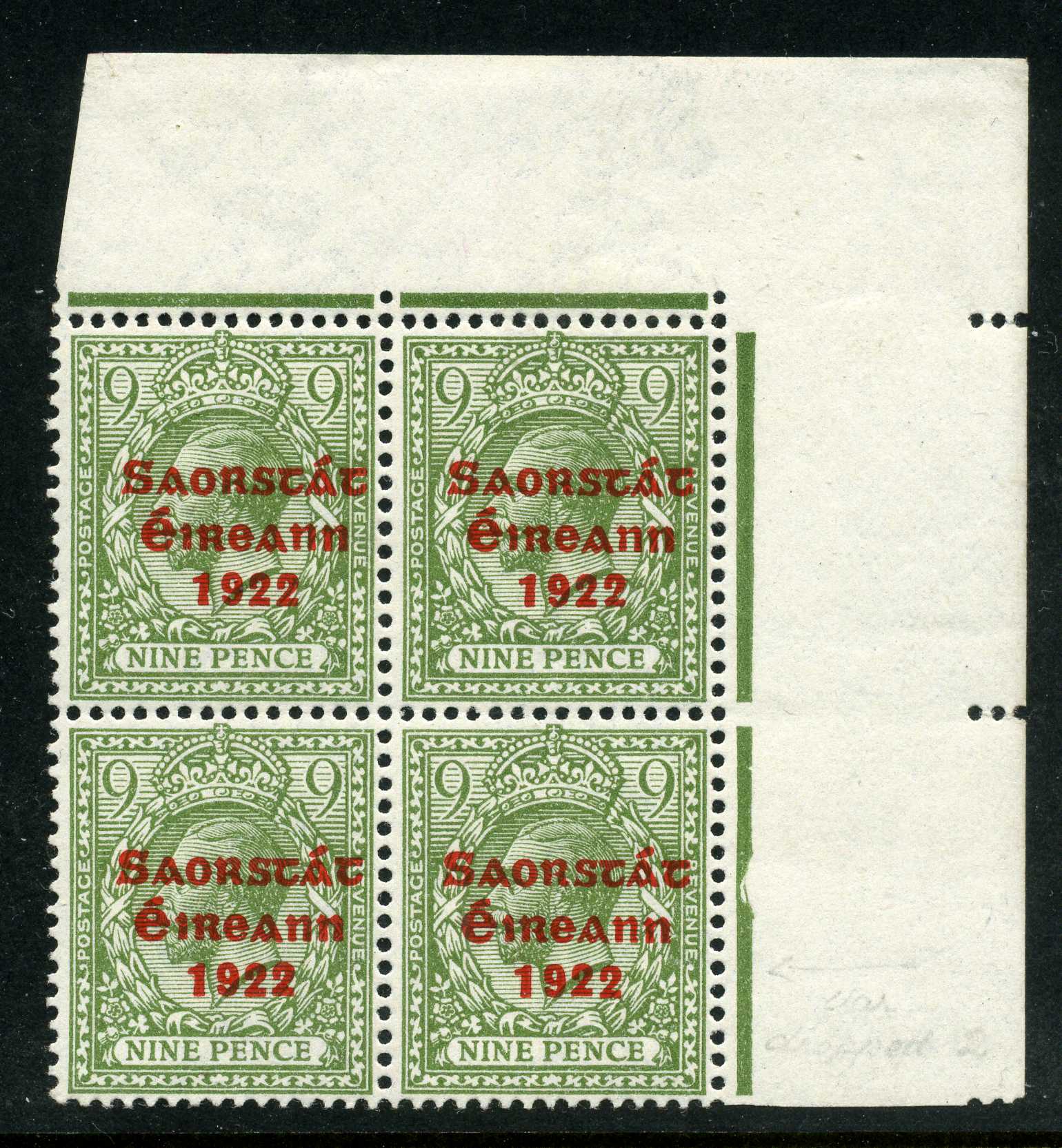 | 1922-3 Thom Saorstat 9d unmounted mint top right corner block of 4 lower right stamp with variety Dropped 2 in 1922. |