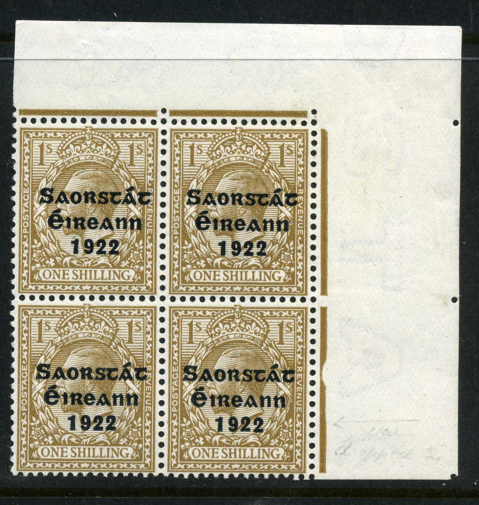| 1922-3 Thom Saorstat one shilling unmounted mint top right corner block of 4 lower right stamp with variety Dropped 2 in 1922. |