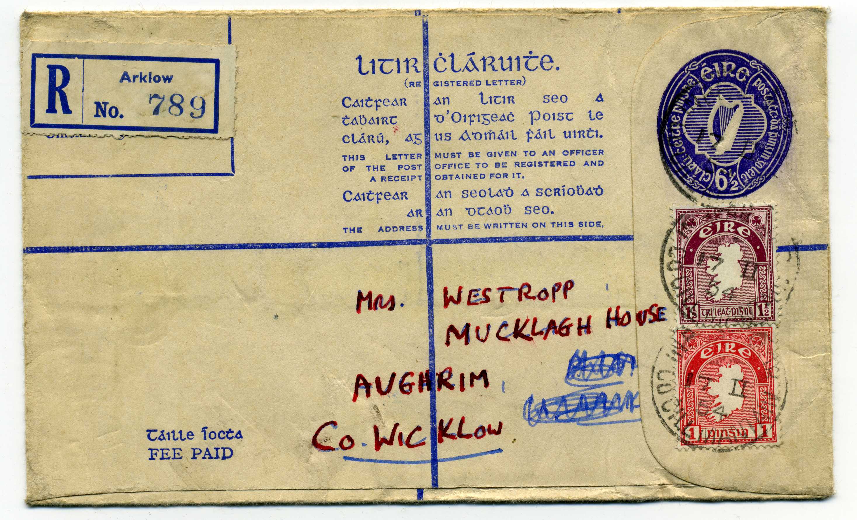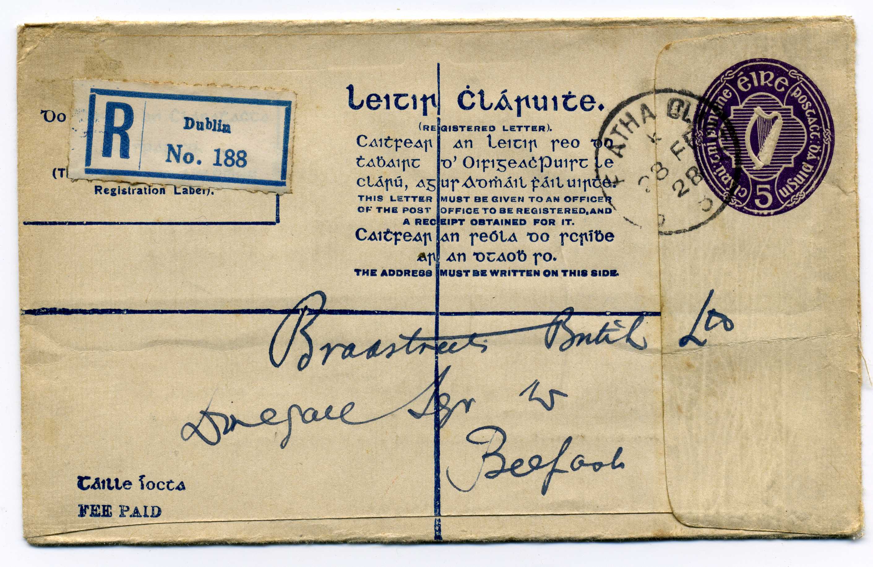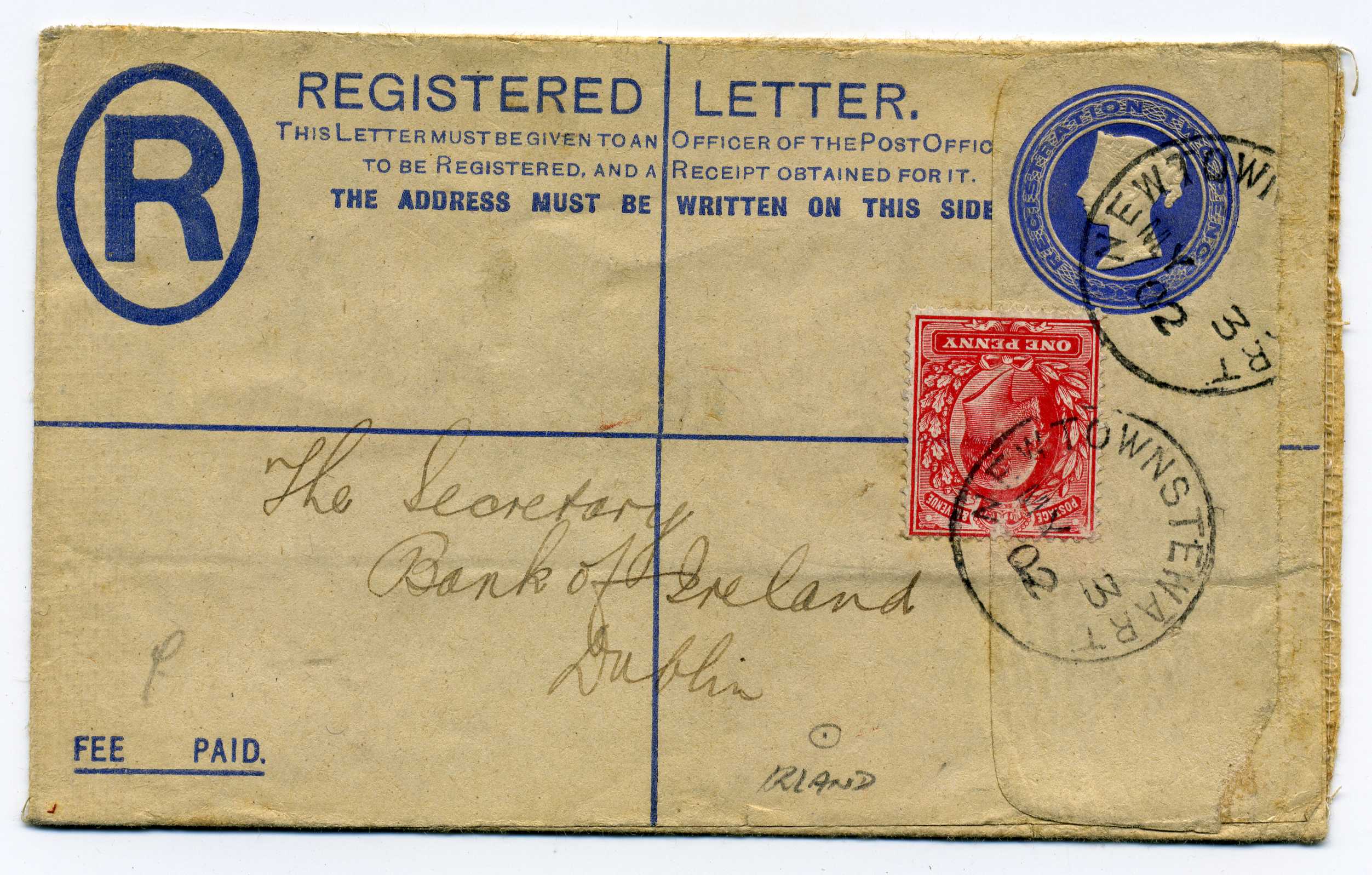 1902 Queen Victoria 2d Blue Postal Stationery Reg Envelope size F with additional 1d adhesive used to Dublin with Newtownstuart cds 3/5/02 40