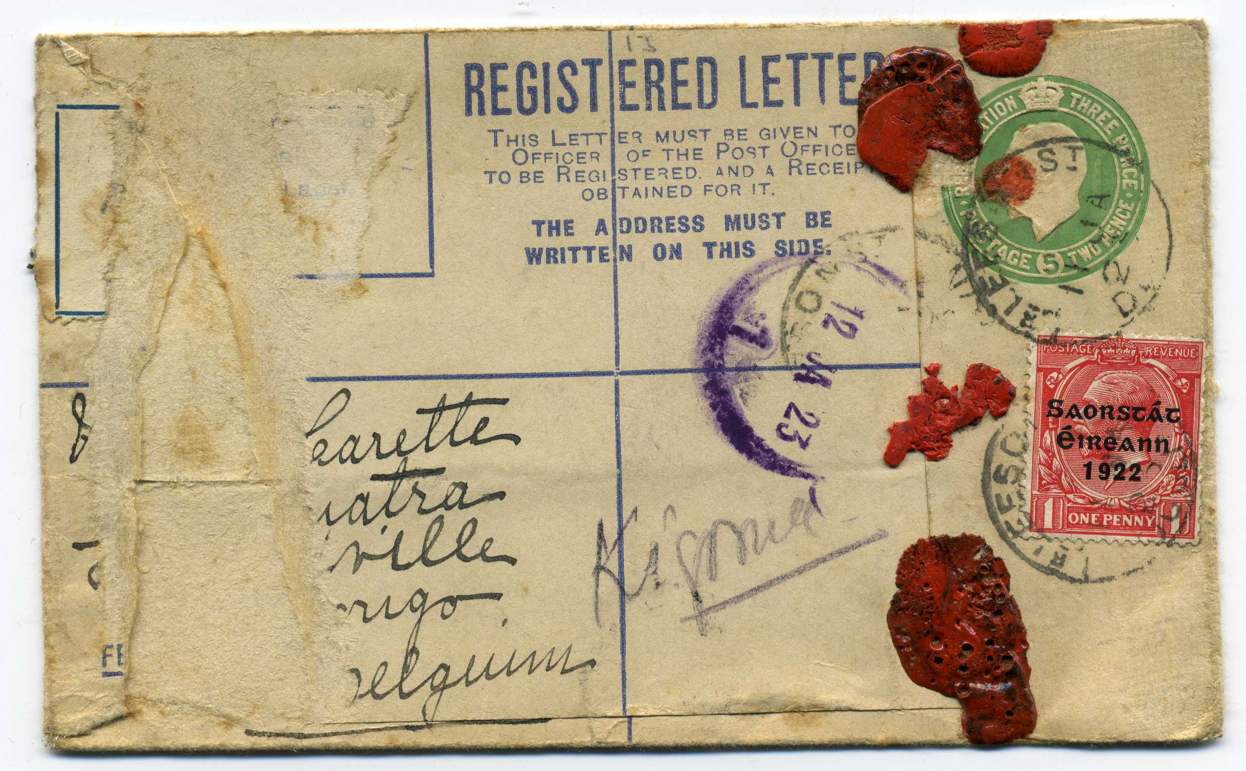 1913 George V 3d Reg Envelope size G used with provisional Kilmessan reg label tied by Navan datestamp. 45