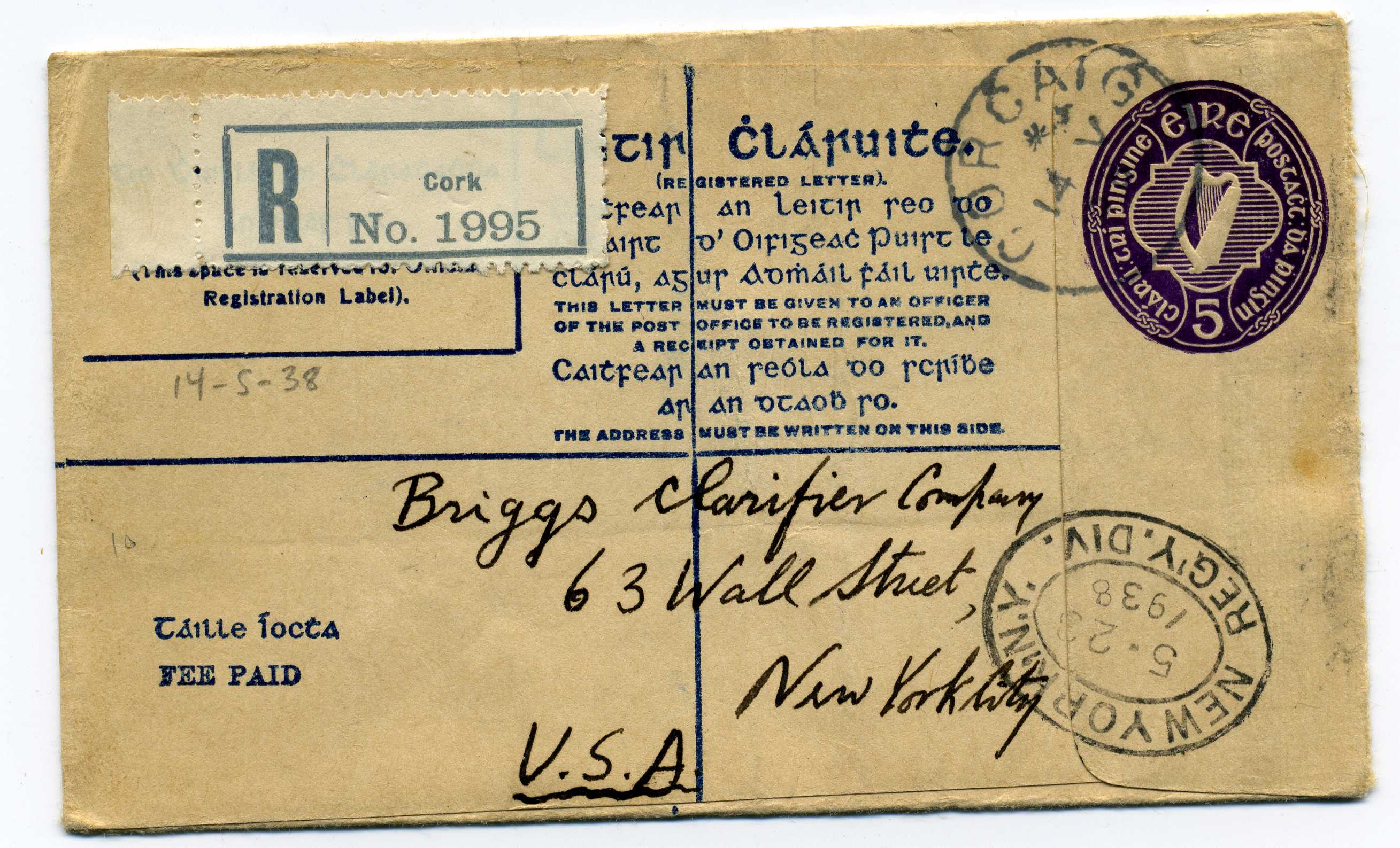 1938 5d Violet Reg Envelope size F used with heavy cancels FAI EU 2c. 20