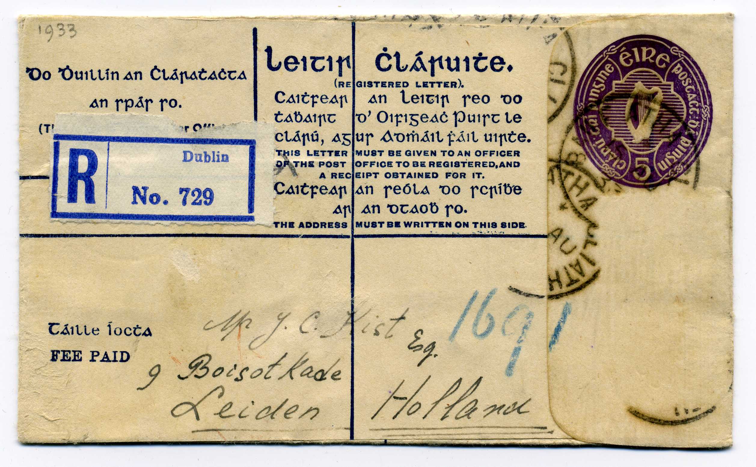 1933 5d Violet Reg Envelope size F used to Holland FAI EU 2c 20