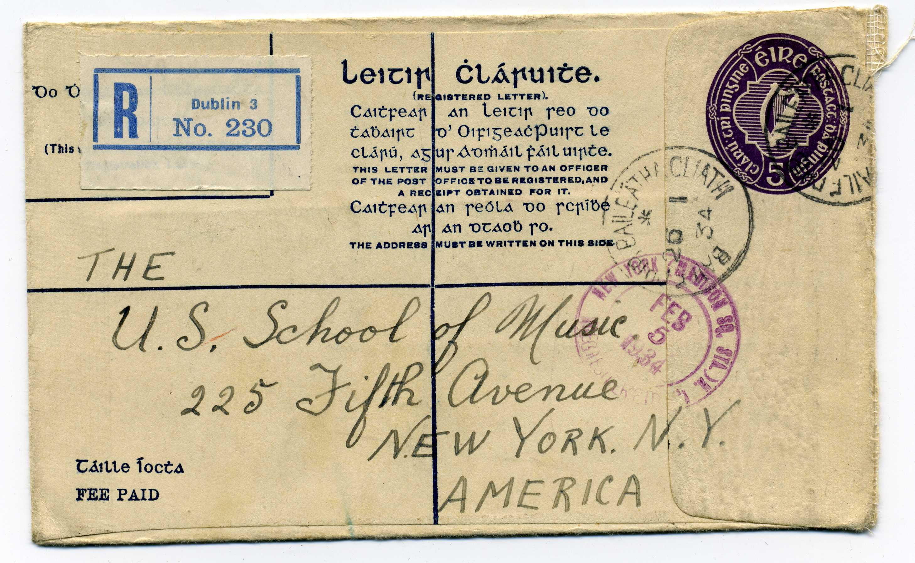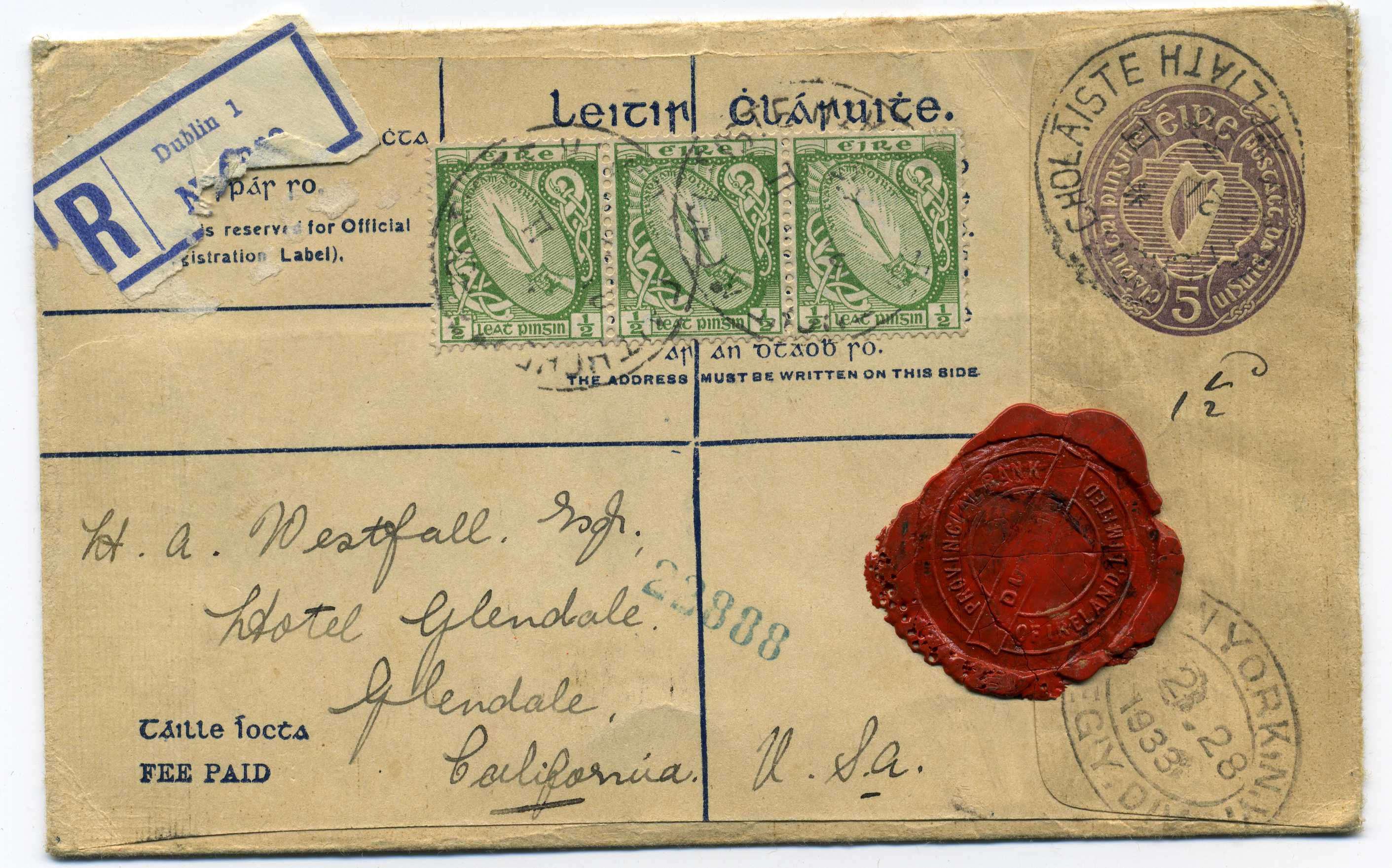 1933 5d Violet Reg Envelope size G used to USA with three additional ½d adhesives, FAI EU 2c 20