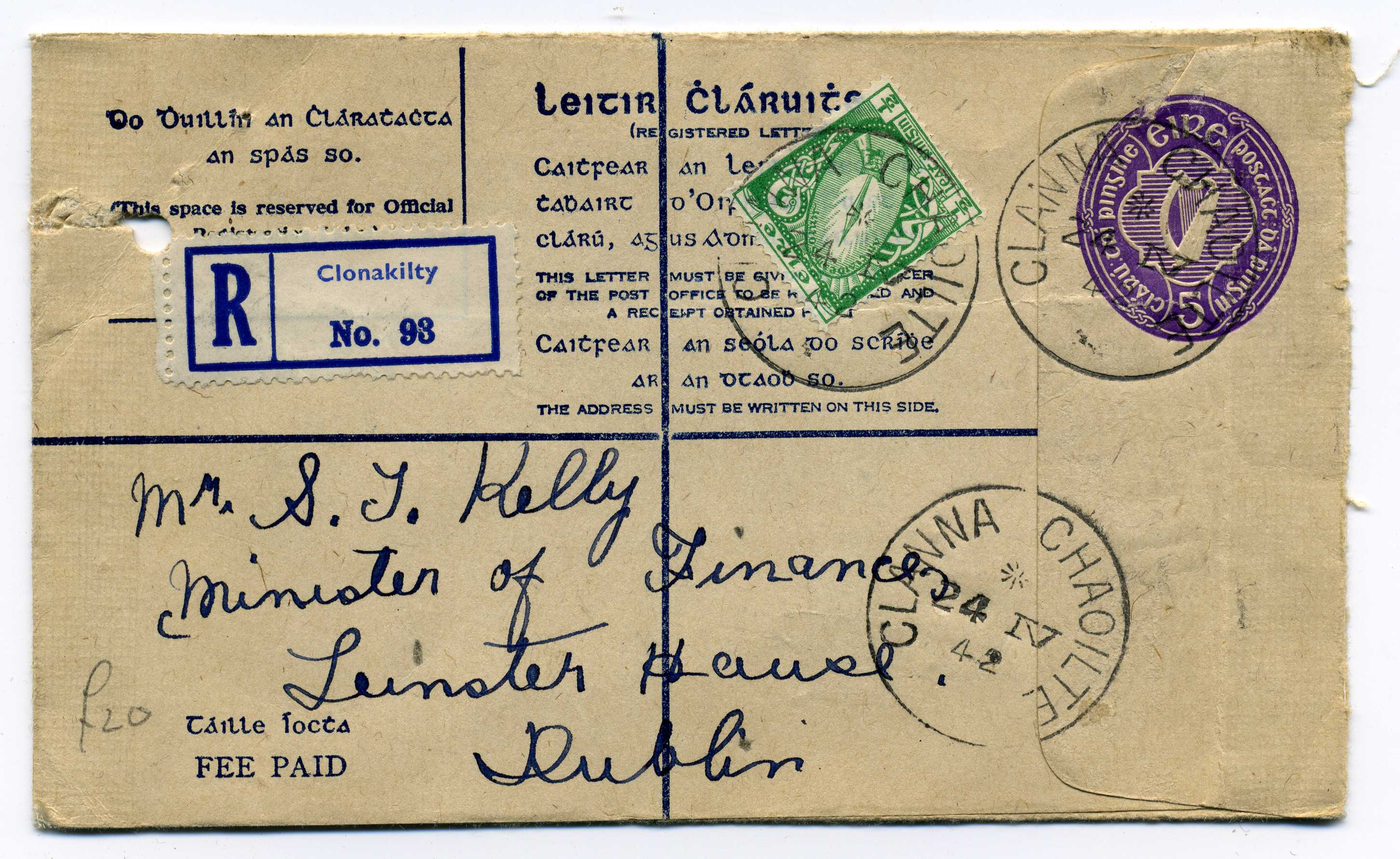 1942 5d Violet Reg Envelope size G with additional ½d adhesive used with file hole at left, FAI EU 2e 25