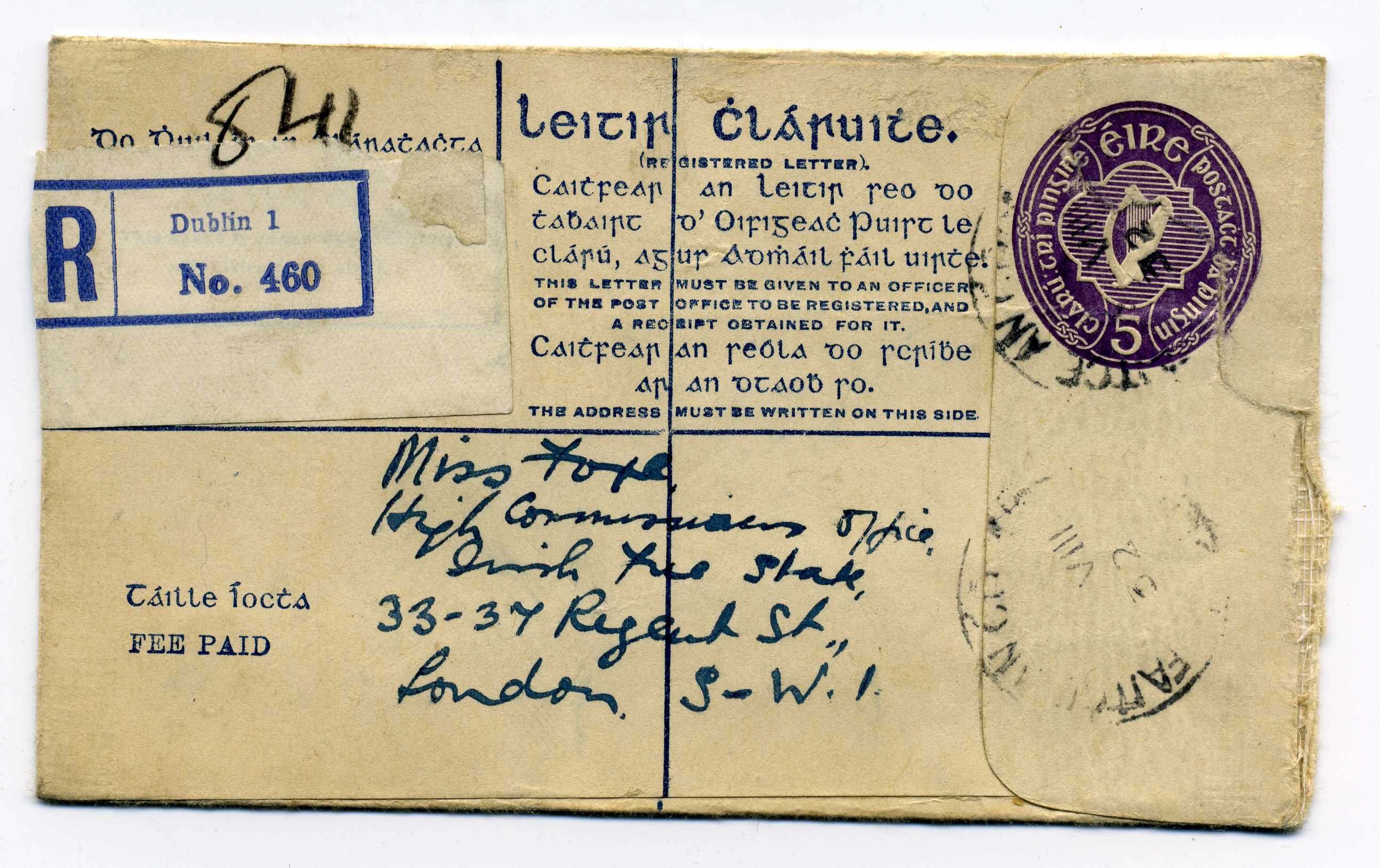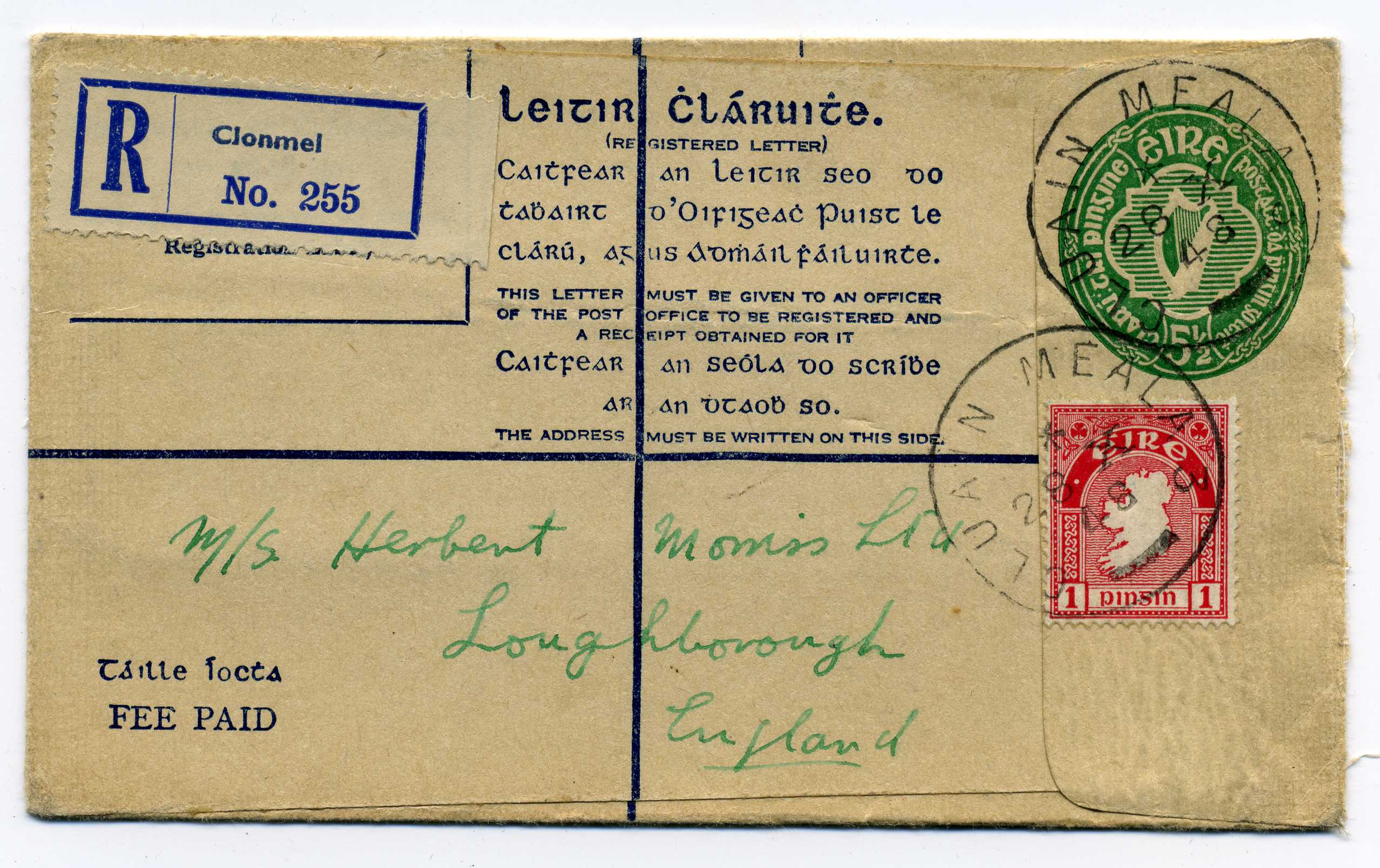 1948 5½d Green Reg Envelope with additional 1d adhesive used to England, one of the scarcer reg envelopes 65